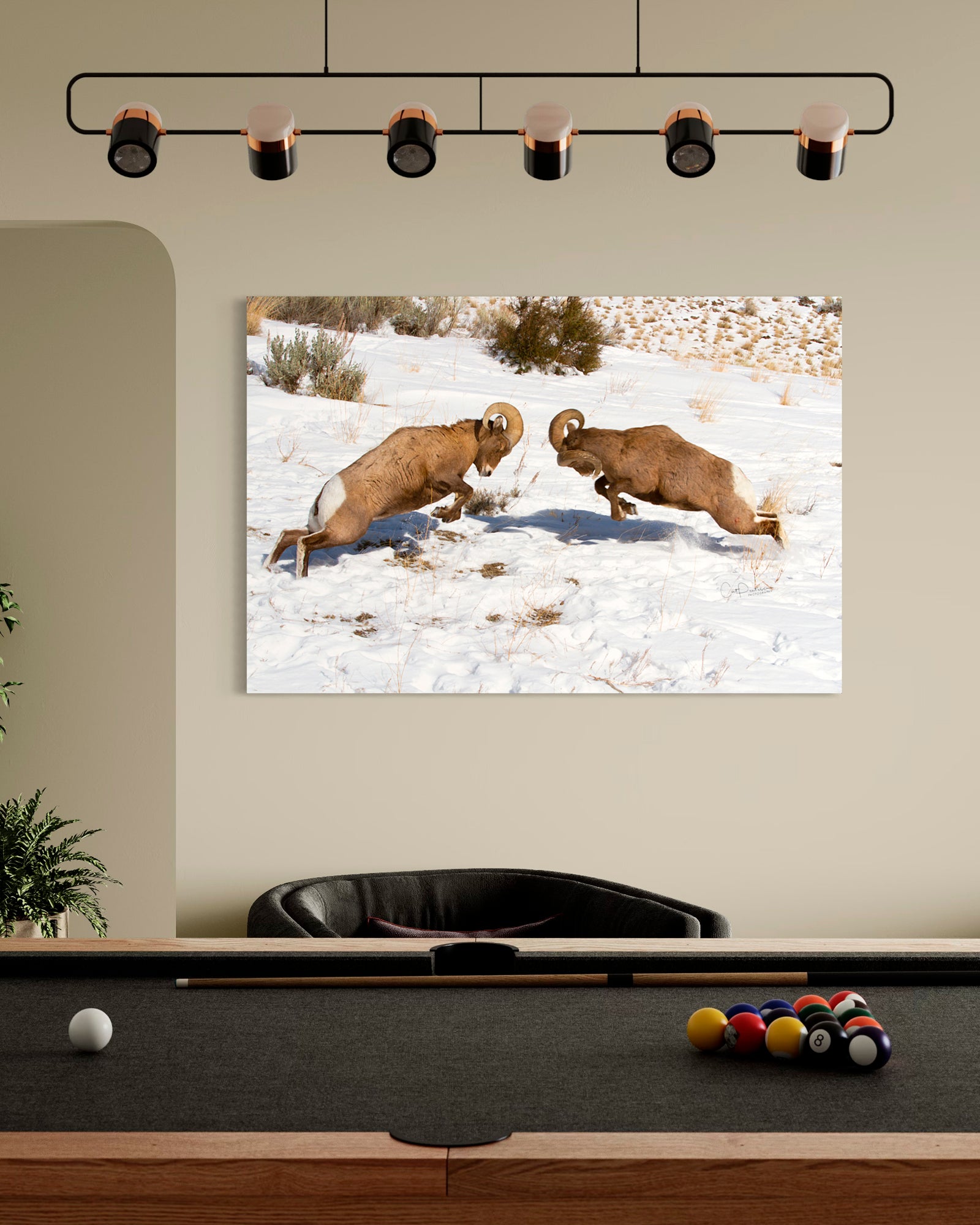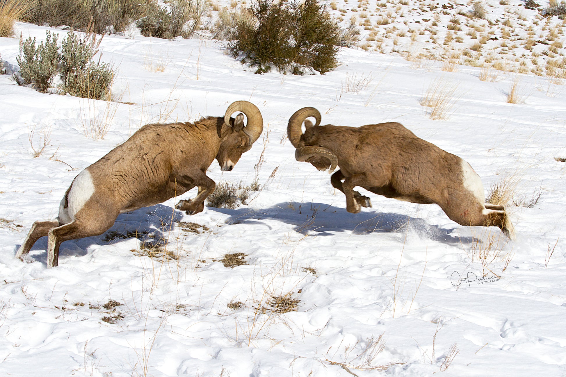 During rut, the Big Horn Rams fight for the right to the ewes in the herd. These two mature Rams were at a point of no return as they hit head on. This is not a slow collision, as they can be traveling up to 40 miles an hour at time of impact. The force and sound when they hit is amazing. I got the opportunity to experience this "wild" behavior in NW Wyoming. It took several hours to capture this image of the point of no return.