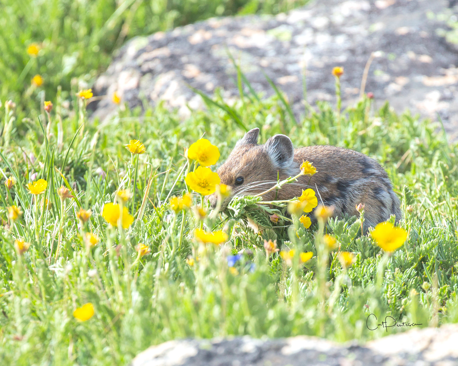Living in elevations of over 10,000 feet, there isn't a lot of summer to gather flowers and grasses that are stored for food to sustain the Pikas through the long winter months as they do no hibernate but stay in their burrows until spring arrives in the mountains. Taken by Nature and Wildlife Photographer, Cat Pentescu.