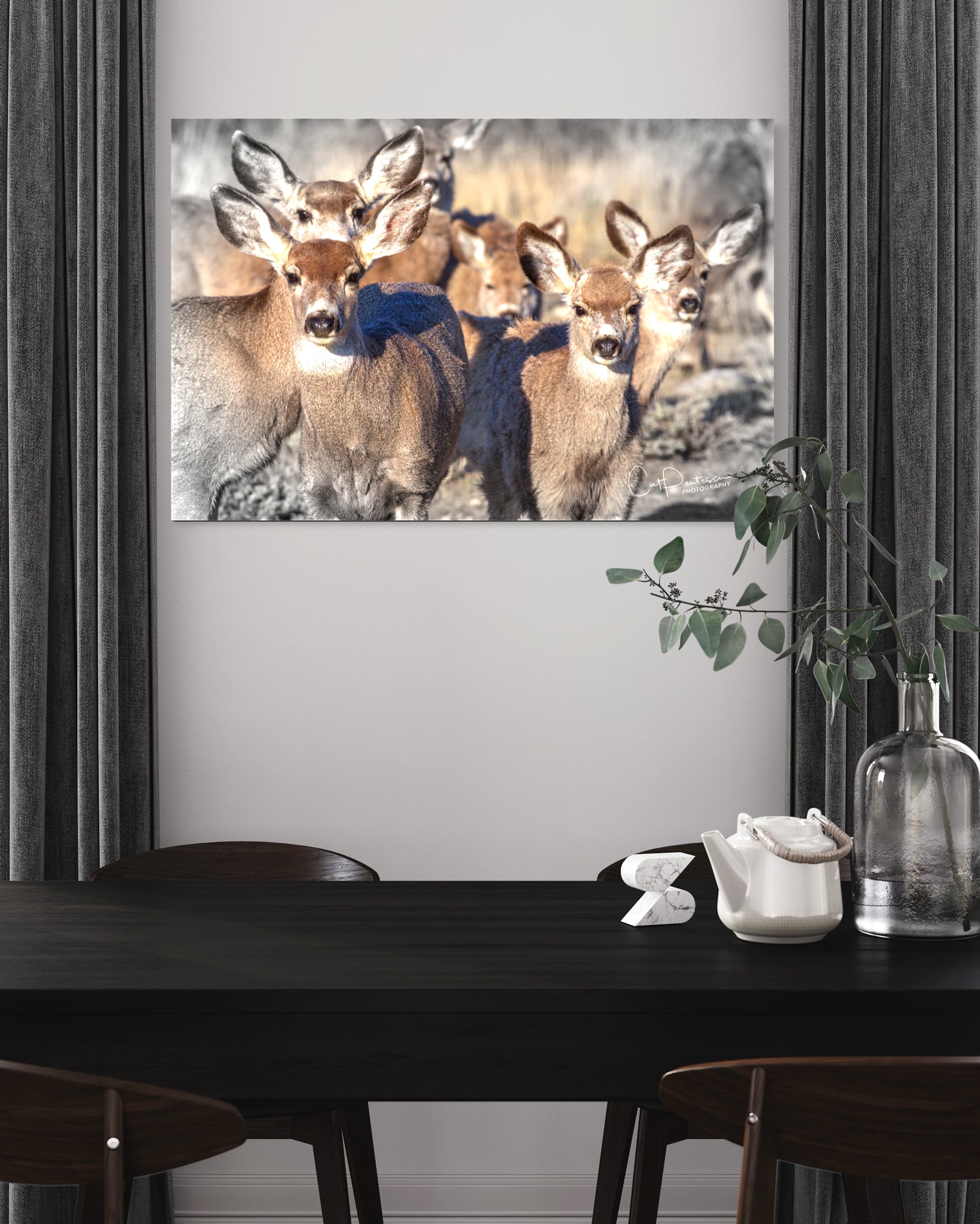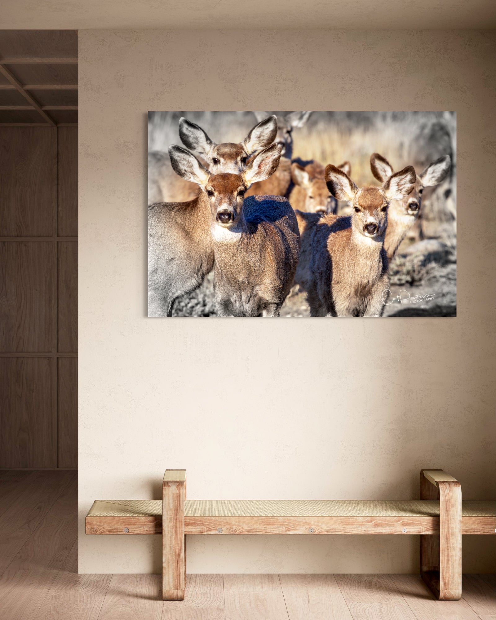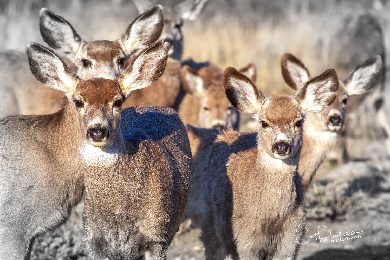 Band of mule deer face to face with my camera! Curiosity got the best of them as they stood together watching me photograph them. Safety in numbers in the wild.