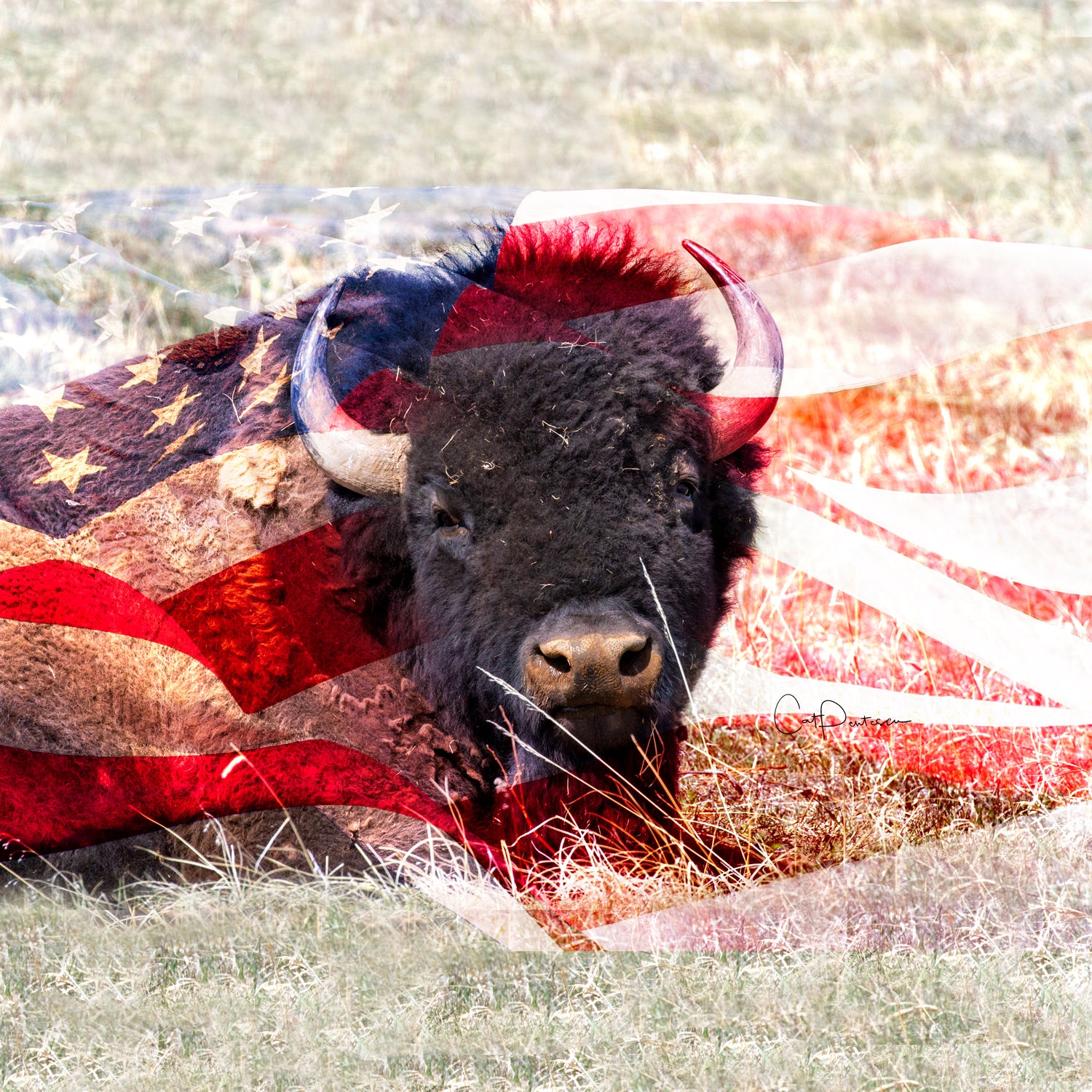Powerful and proud montage with two ionic symbols. Whether you call him a buffalo, bison or Tatanka, his American roots run deep in US history, as does Old Glory, our American flag.