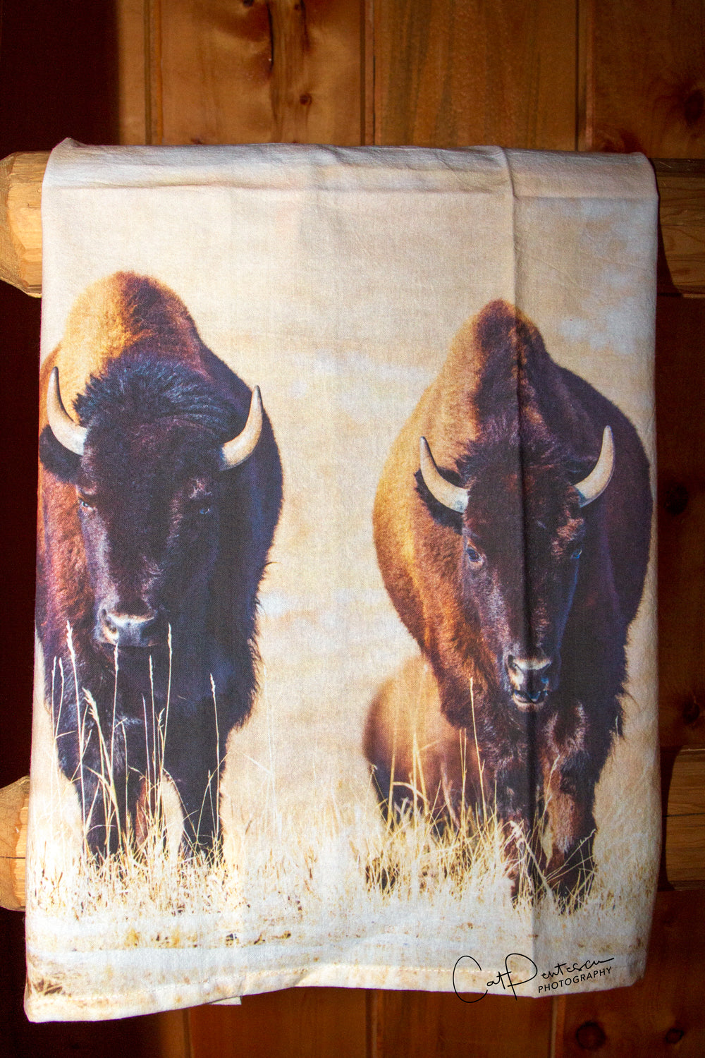 Two serious lady buffalo headed straight for you on one end and a youngster on the other fill this flour sack towel with images from the wild.