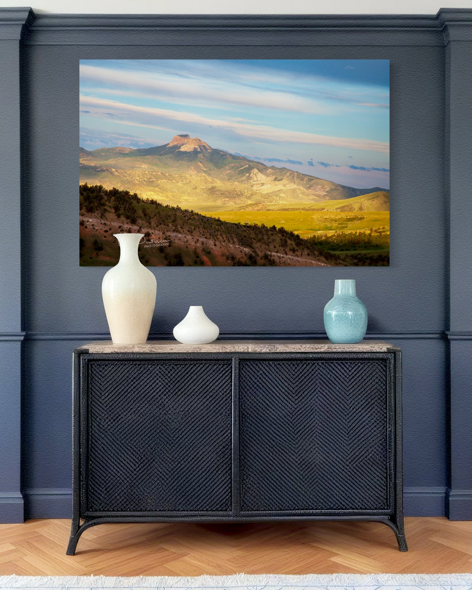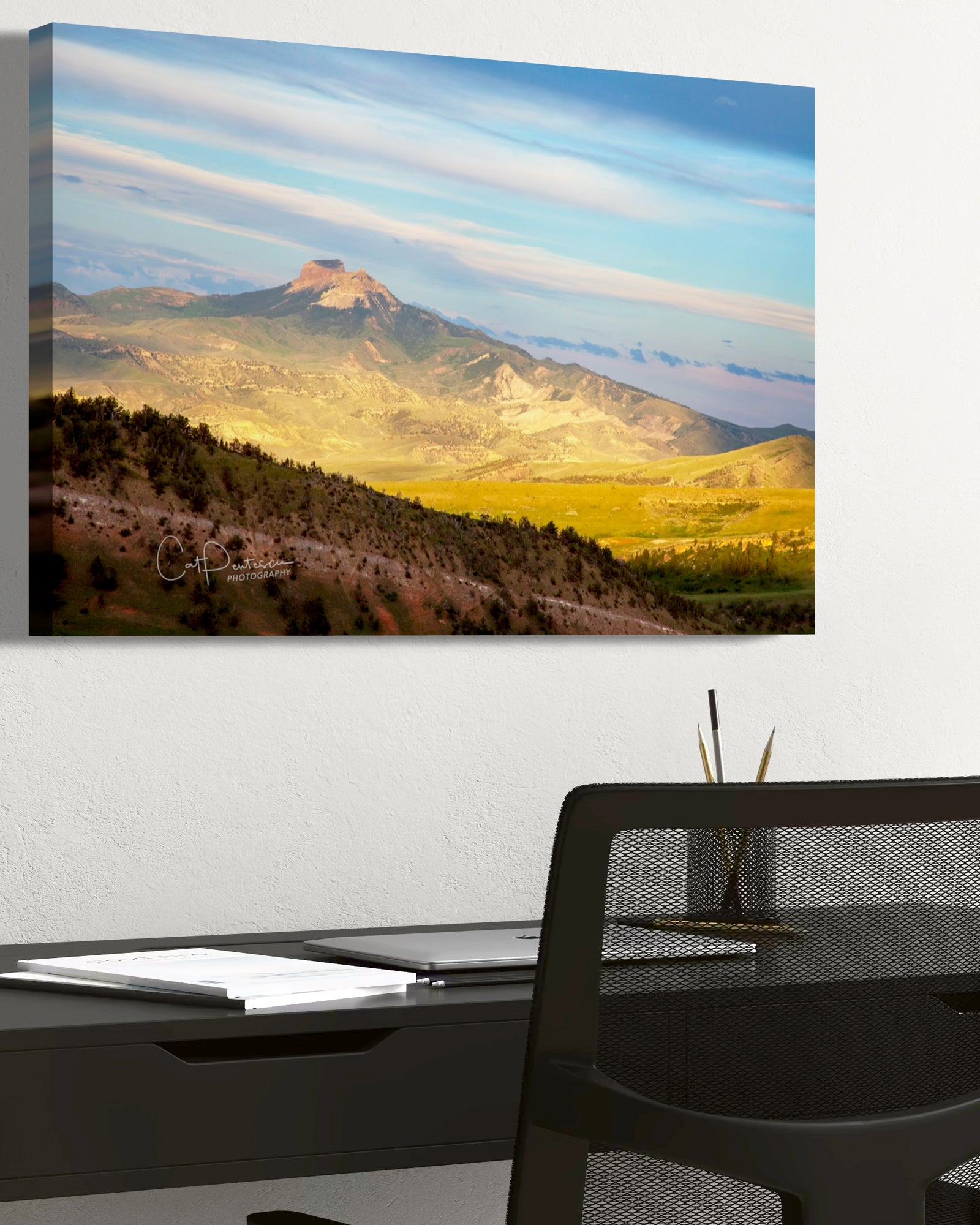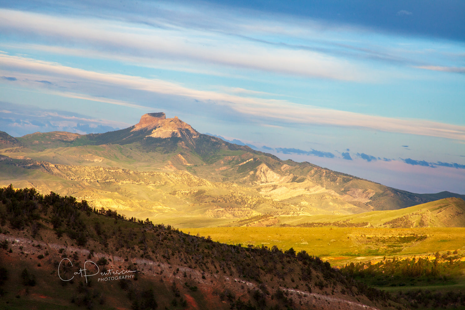Heart Mountain in some very intense, dramatic light in Northwest Wyoming, USA. The lights and darks created by the strips of clouds adds to the drama of the image. It is 8,123 foot high, and rises up from the floor of the Bighorn Basin. So full of history and unique in its own right.