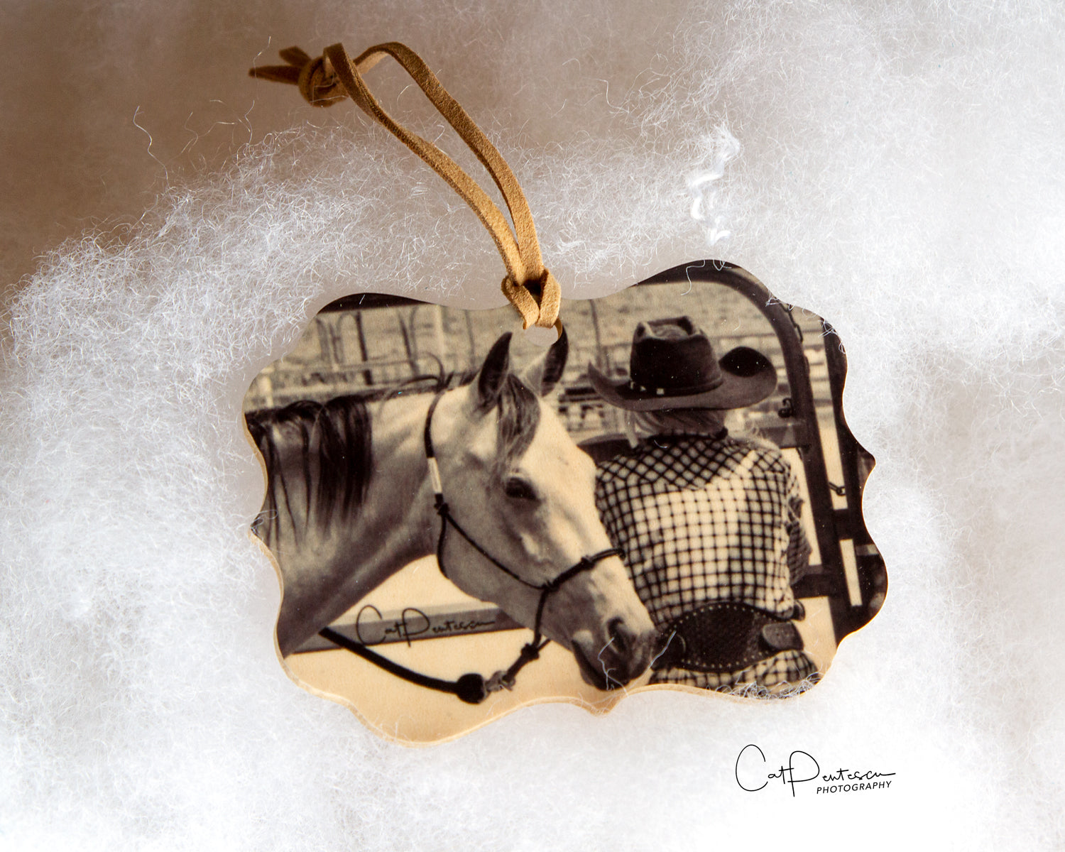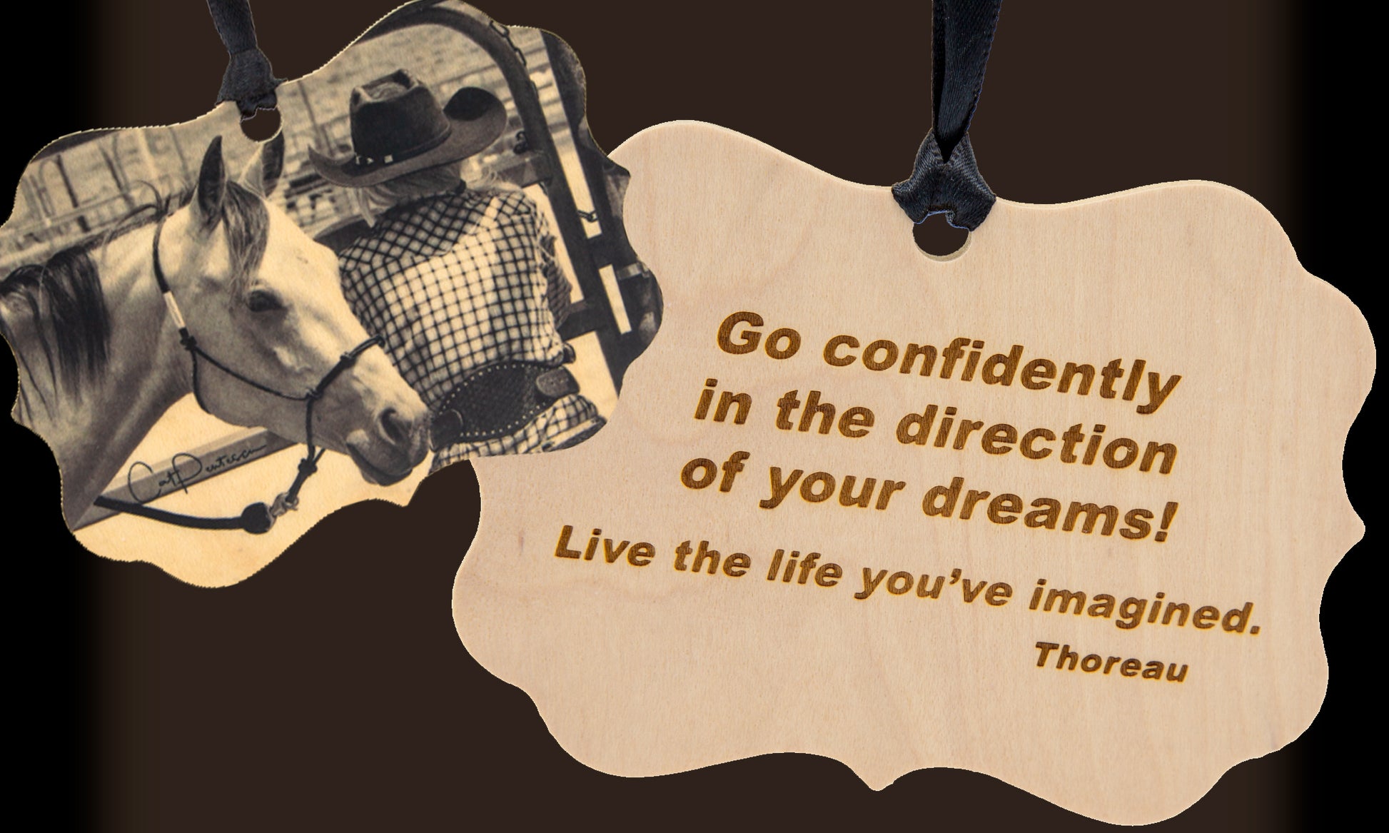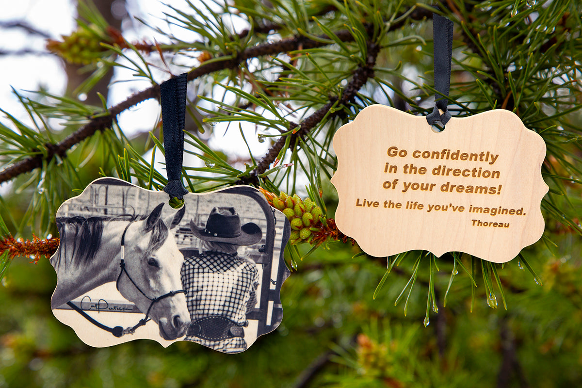 Inspired By Life - "Go Confidently" on wood. Horsewoman at the arena gate with horses, waiting to compete. This black and white image has an aged look with wood grain showing through light areas. The back is engraved with inspiring words for all. This special ornament/medallion can be hung at Christmas or year 'round.