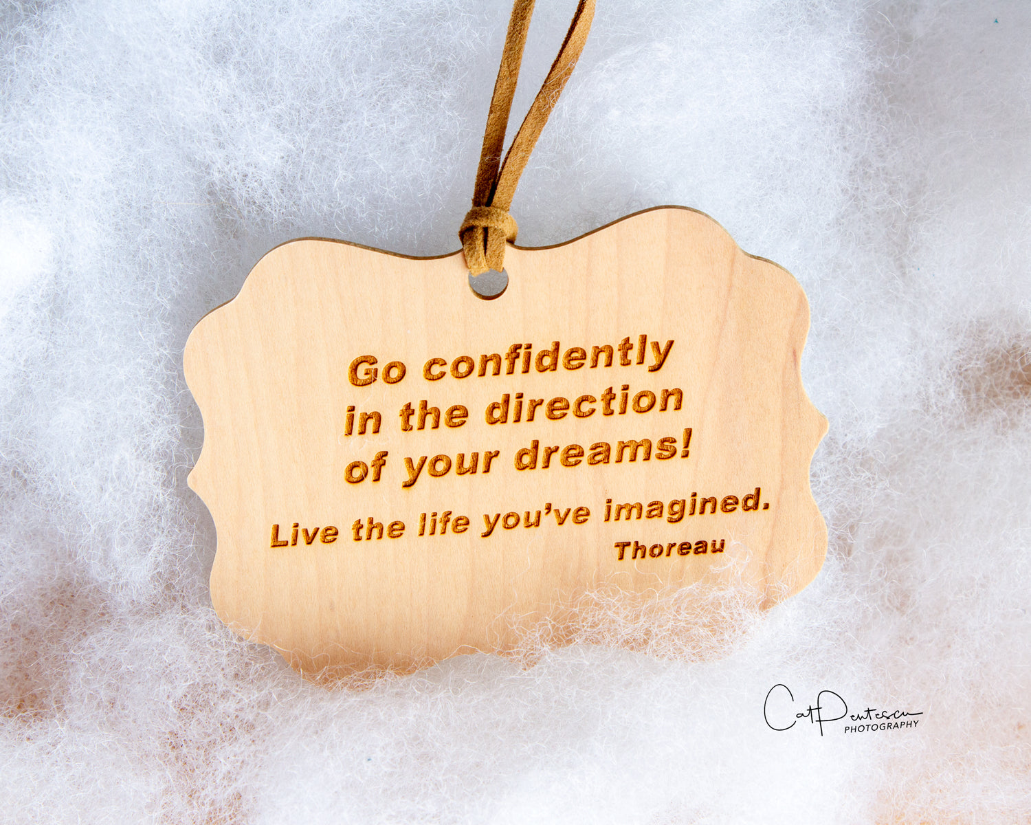 These ornaments have a wood base with a semi-gloss finish on both sides. A subtle wood grain pattern may appear through the white or light areas of the image and engraving is on the back.