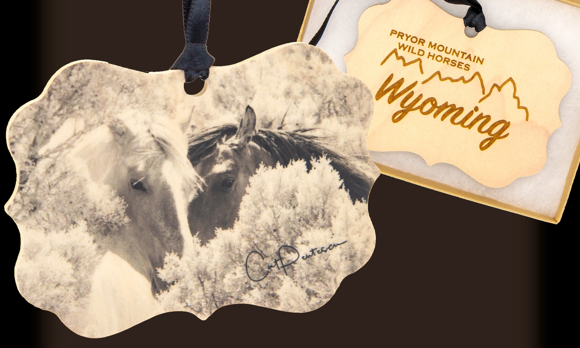 These Shy Guys kept their eyes on me from behind the brush but did not venture out. The timelessness of Black and White image of two cautious wild horses in the Pryor Mountains has an aged look with wood grain showing through light areas. The back is engraved with my custom design to remind you where these guys are hiding out. This special ornament/medallion can be hung at Christmas or year 'round