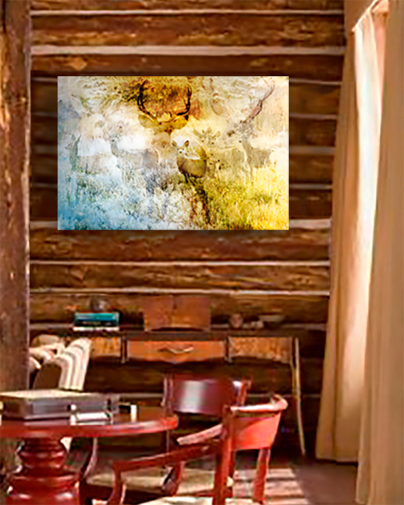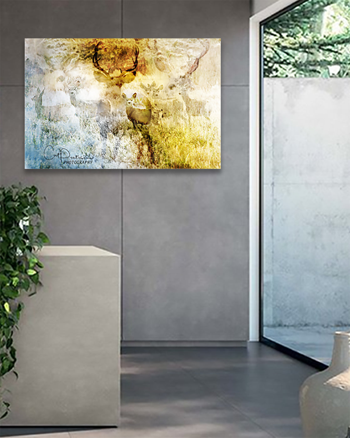 It took a unique blend of five images of mule deer and some "magic" to create this montage. A great conversation piece. The question is " How many deer do you see?!"
