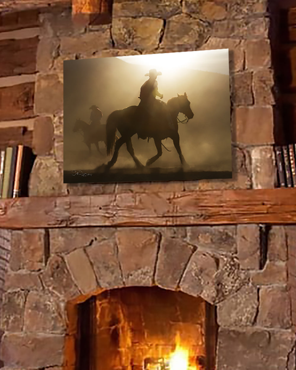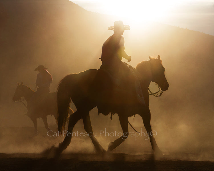 Timeless, western image. What says Wild West like a Cowboy and Cowgirl riding along a dusty trail in the late afternoon sun. Great piece of Western Art for your home or office. This is one of the images in my "Riding in the Dust" series.
