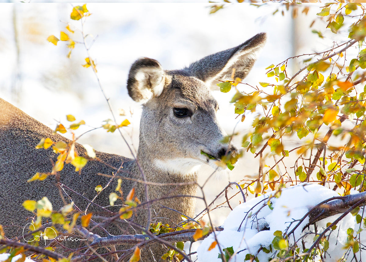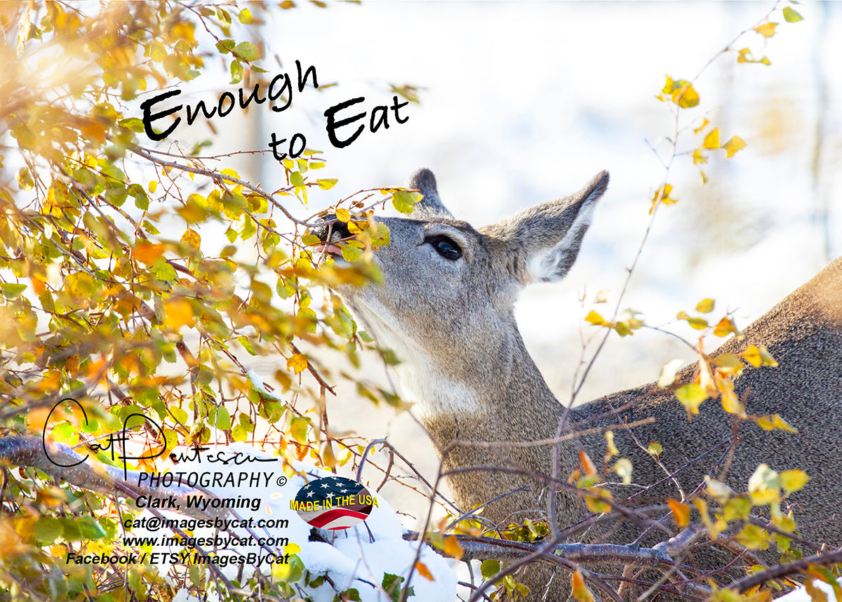 The golden leaves of fall with a bit of snow reminds the wildlife to get it while it is there. This mule deer buck was taking advantage of some of the last foliage of the season. This 5"x7" full color greeting card is blank inside, ready for you to add your personal message. My greeting cards are press printed on quality card stock in the USA. Envelopes are included.