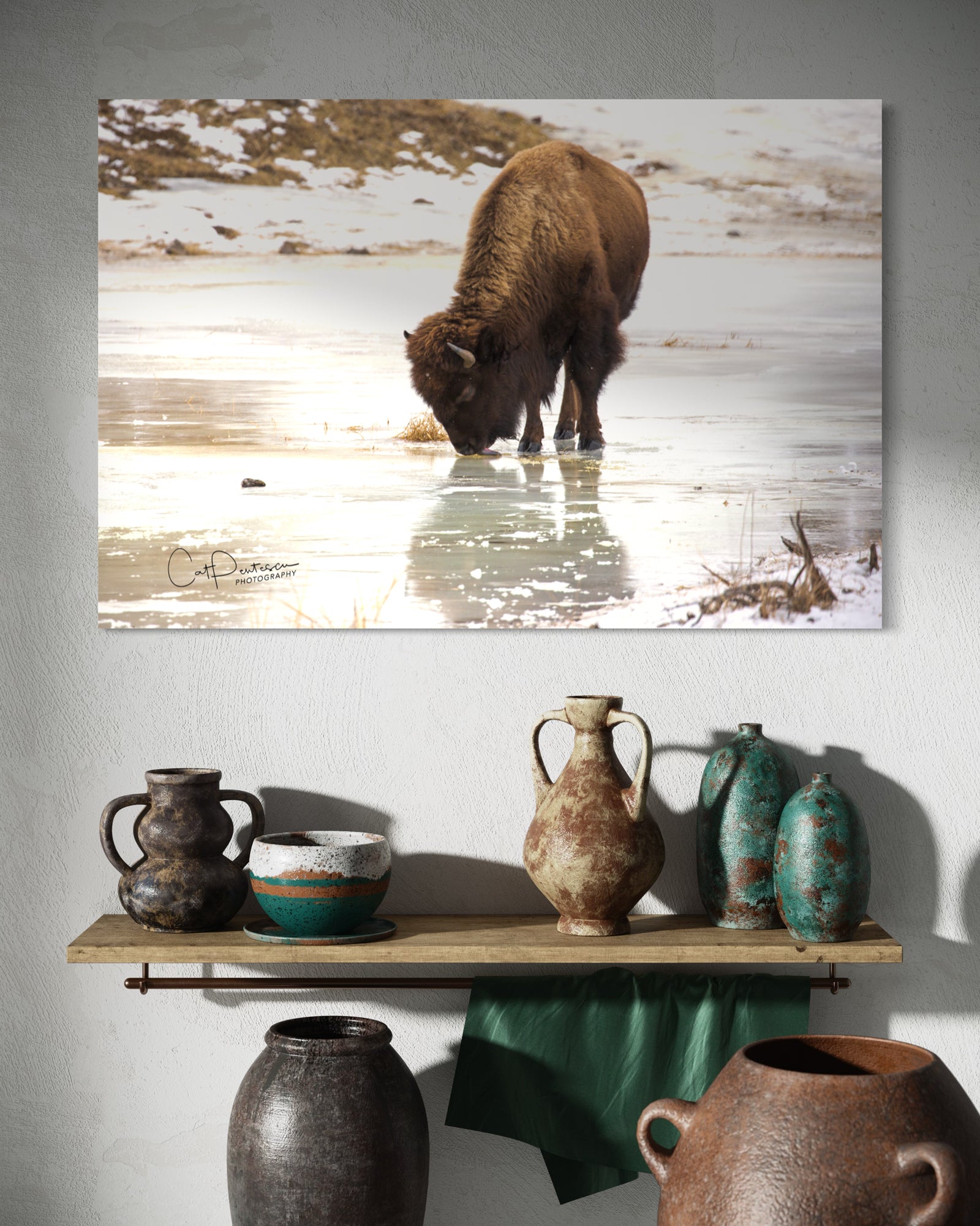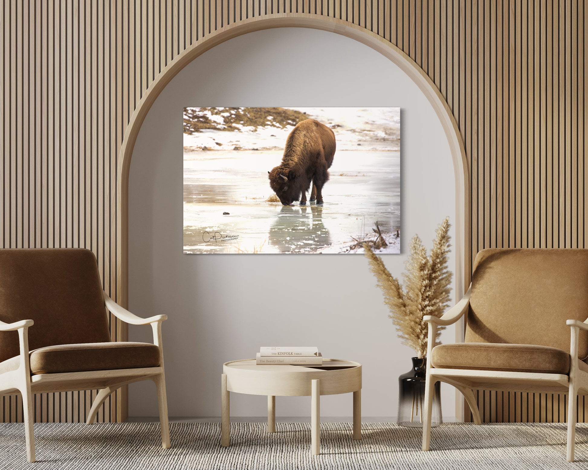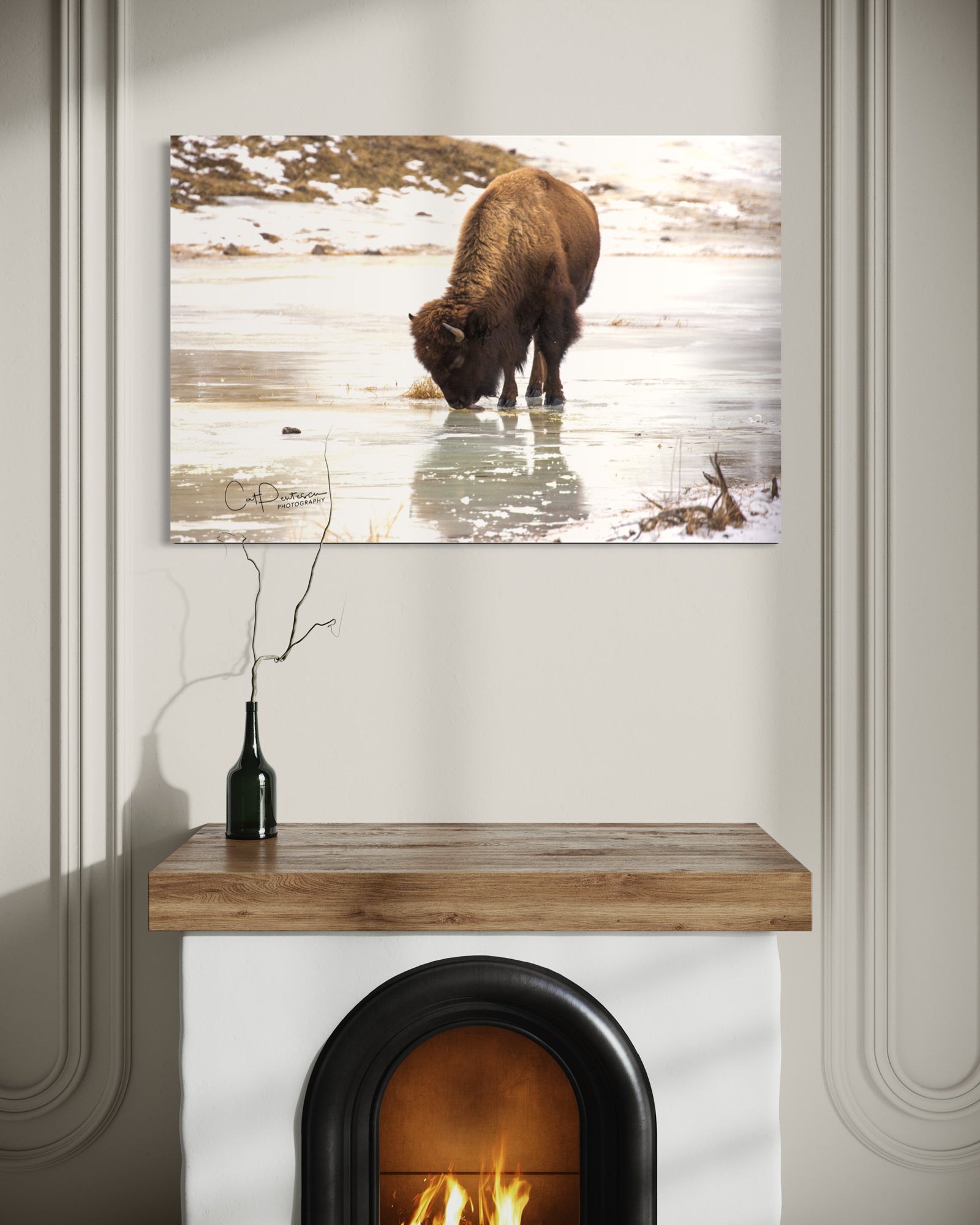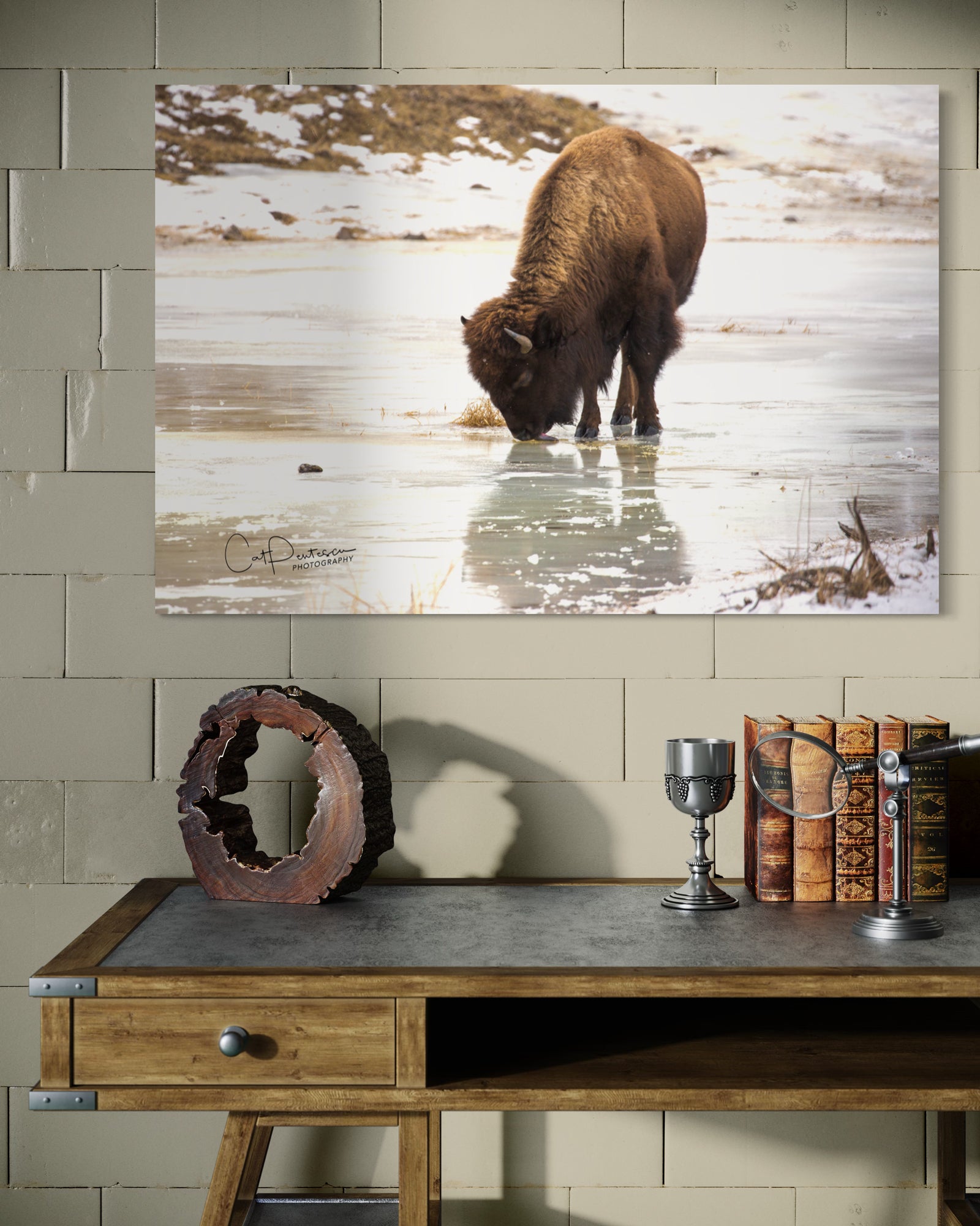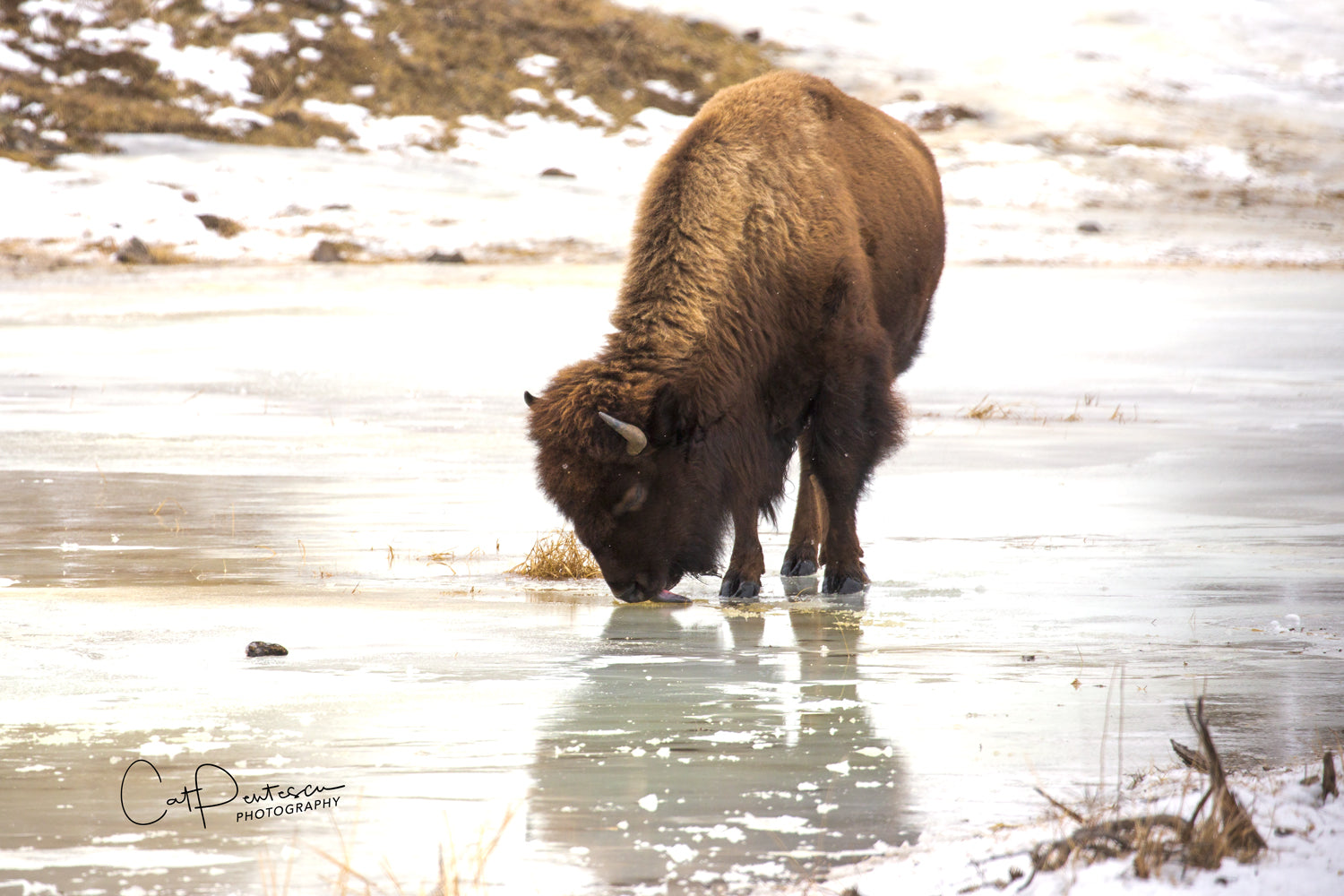 Buffalo on ice! Winter is such a unique time of year in the wild. The chance encounter seeing these amazing beings make their way across frozen ponds, walking cautiously so as not to slip, and stopping to lick the ice was incredible. The details in this image are really special. From the morning light, her tongue licking the ice, to her frozen reflection, you can witness it all. This is real, this is survival in the wild, getting a drink where it can be found in the winter. This is life.