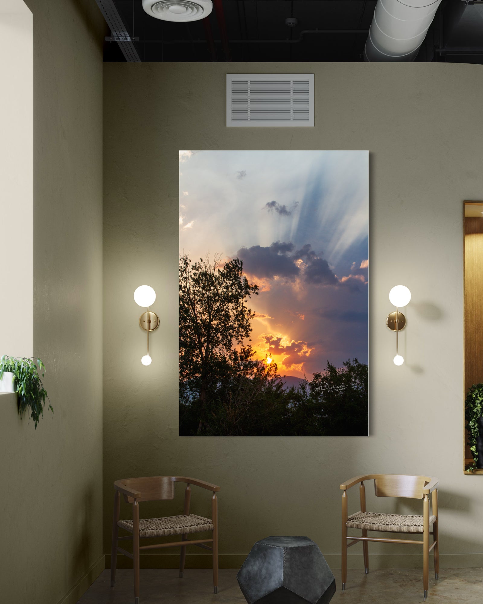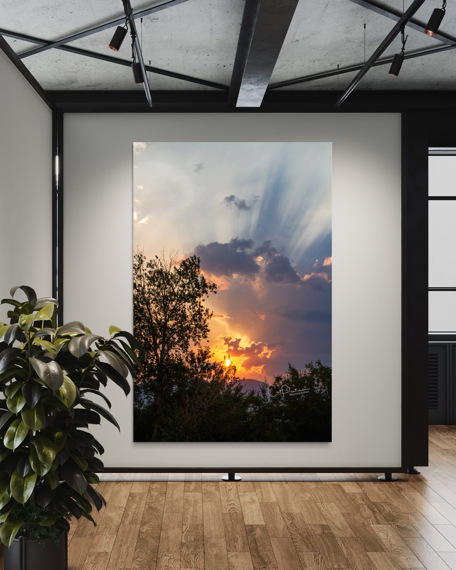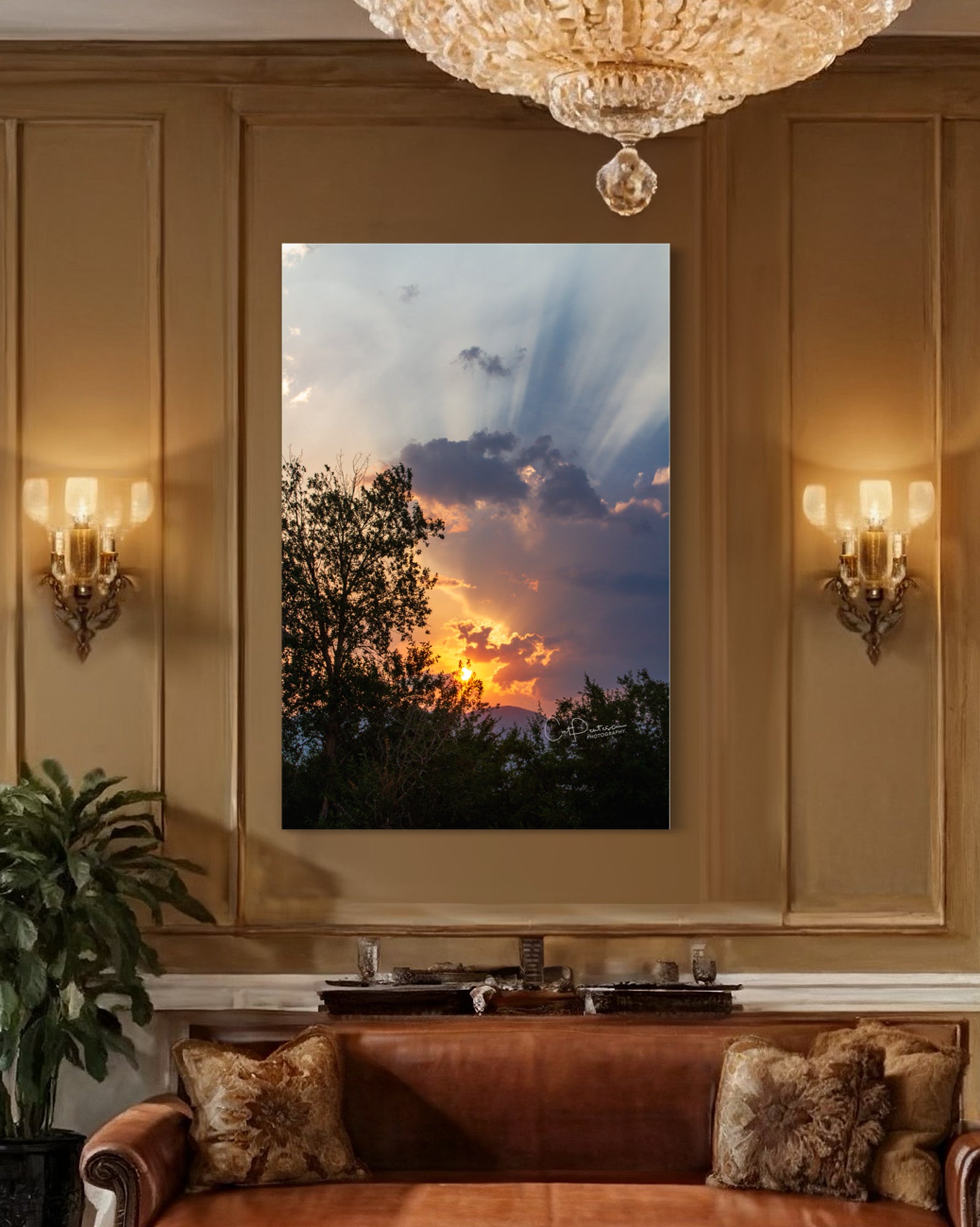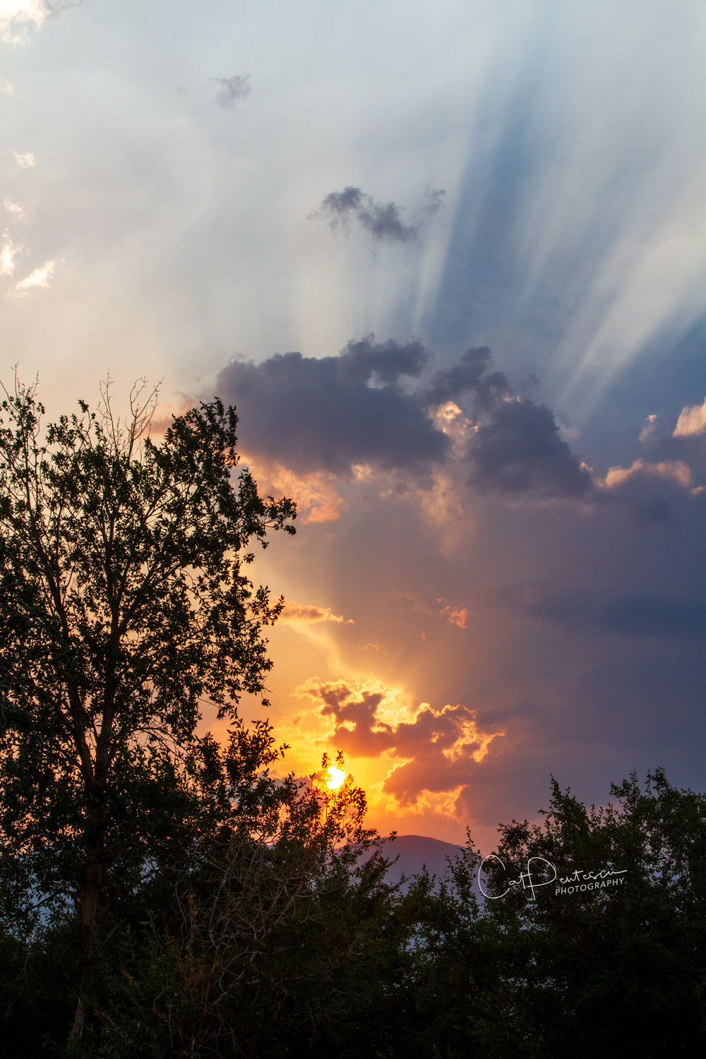God's rays painting the sky at sunset. (God's rays are sunbeams that originate when the sun is near or just below the horizon, during twilight hours.) One of the most intriguing sunsets I have witnessed and been able to capture in a long time.