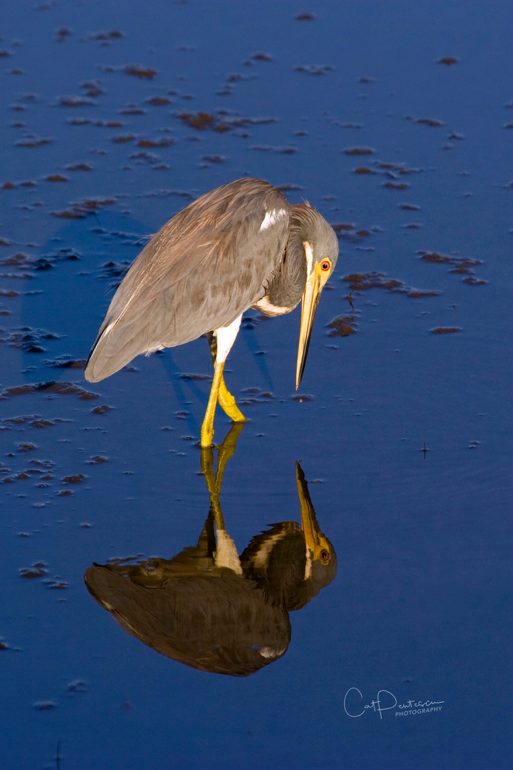 Beautiful detail as this blue heron seems to be staring at itself in it's almost perfect reflection. The water was so blue the bird seems grey in comparison.