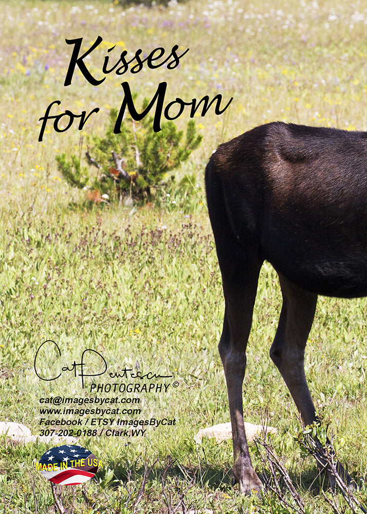 Moose calf reaching up to give mom a kiss while she keeps a keen eye out for danger. This 5"x7" full color greeting card is blank inside to write your message.