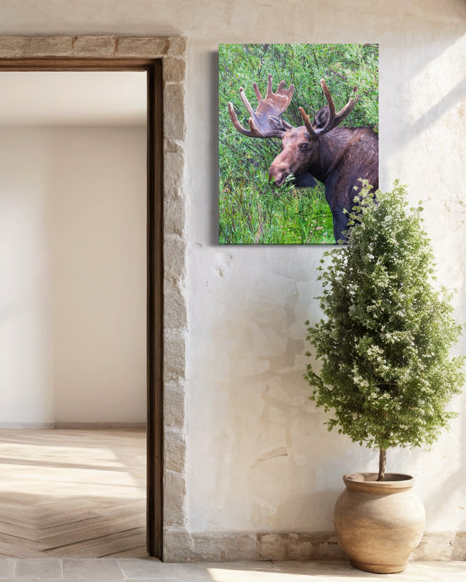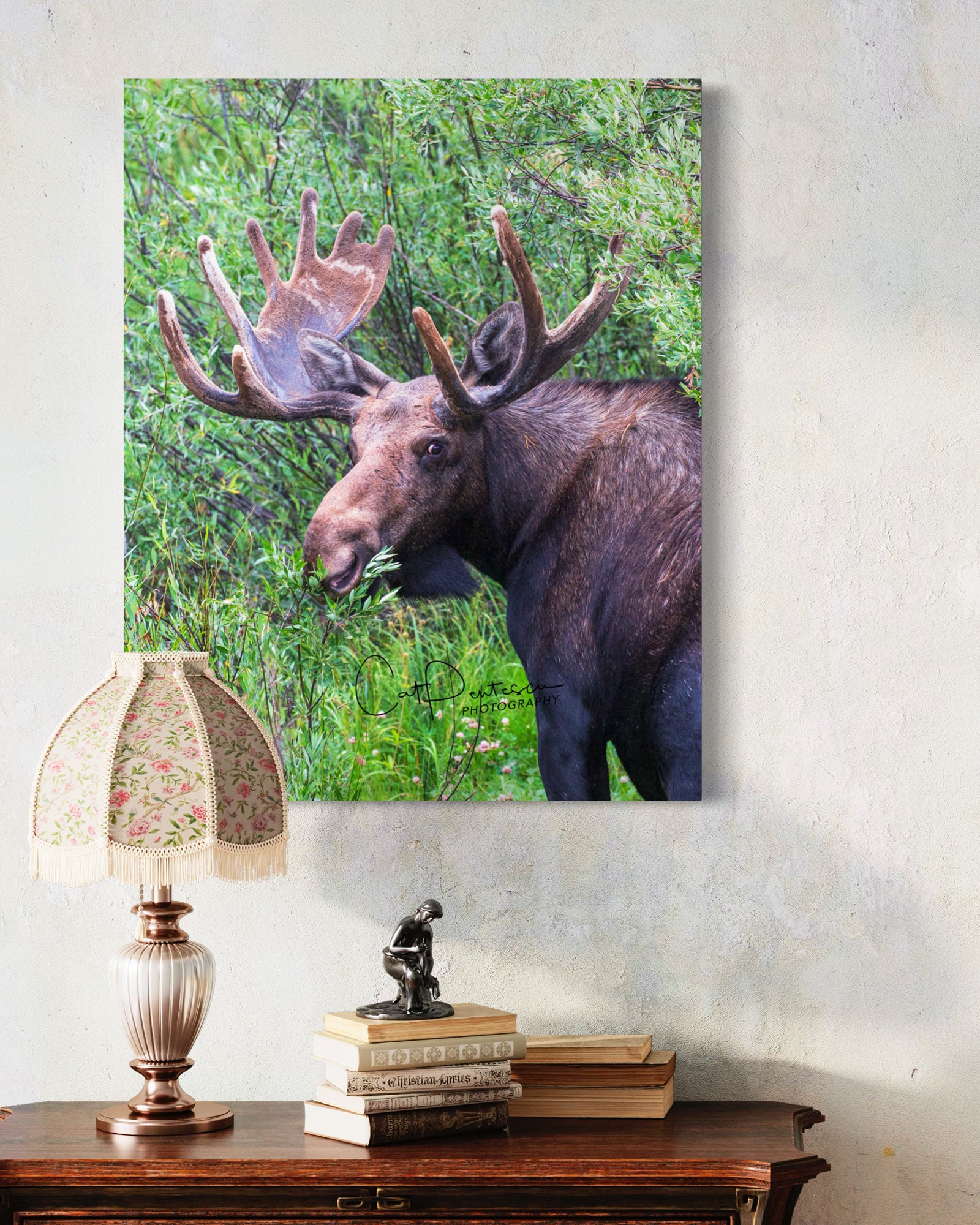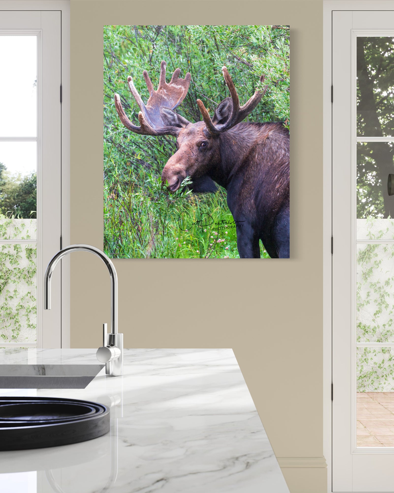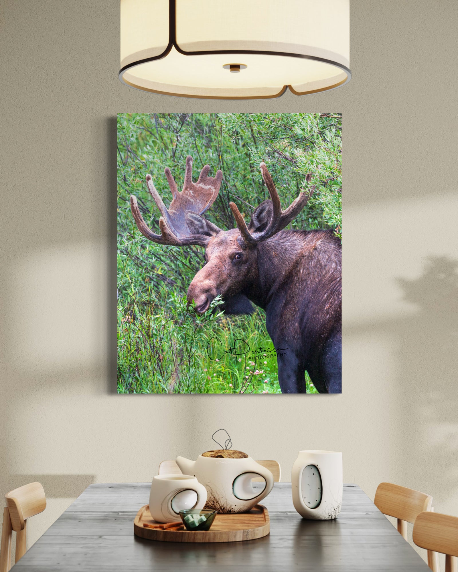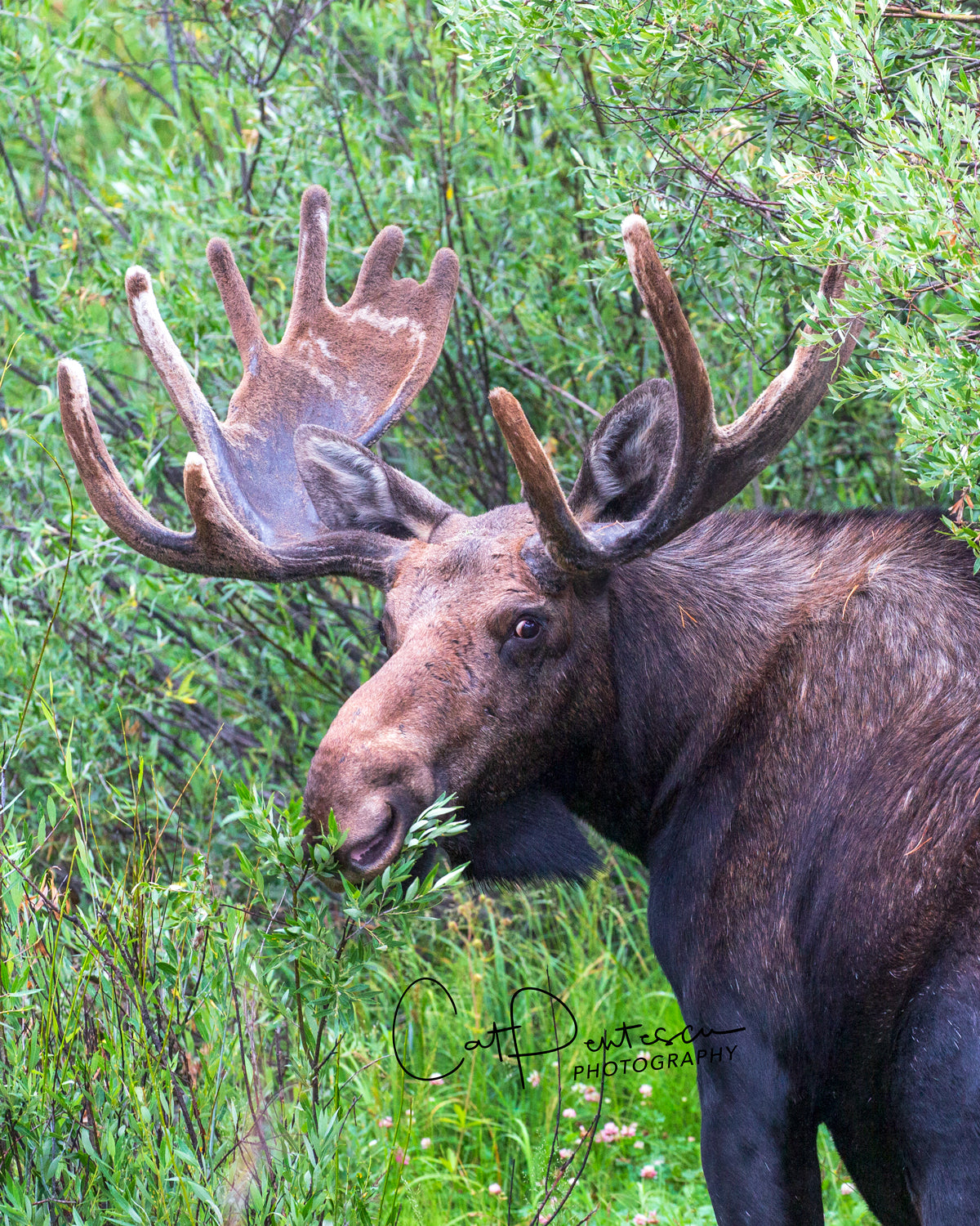 Caught him with his mouth full! Big bull moose getting his fill of greens for lunch. Taken by Nature and Wildlife Photographer, Cat Pentescu.