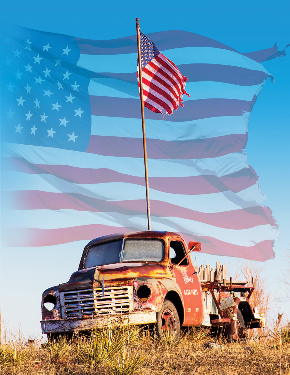 Old truck and tattered flag still standing proud in the USA!