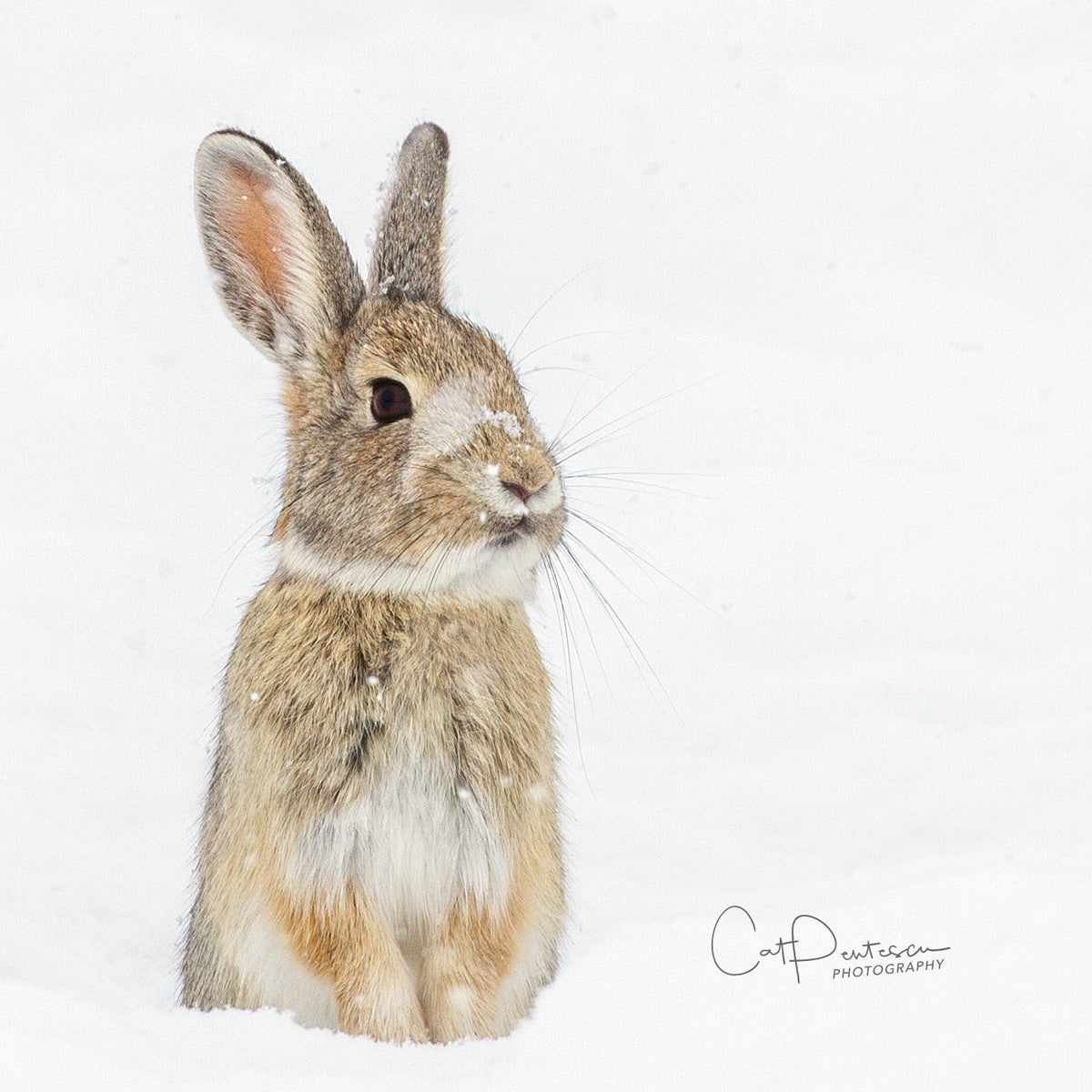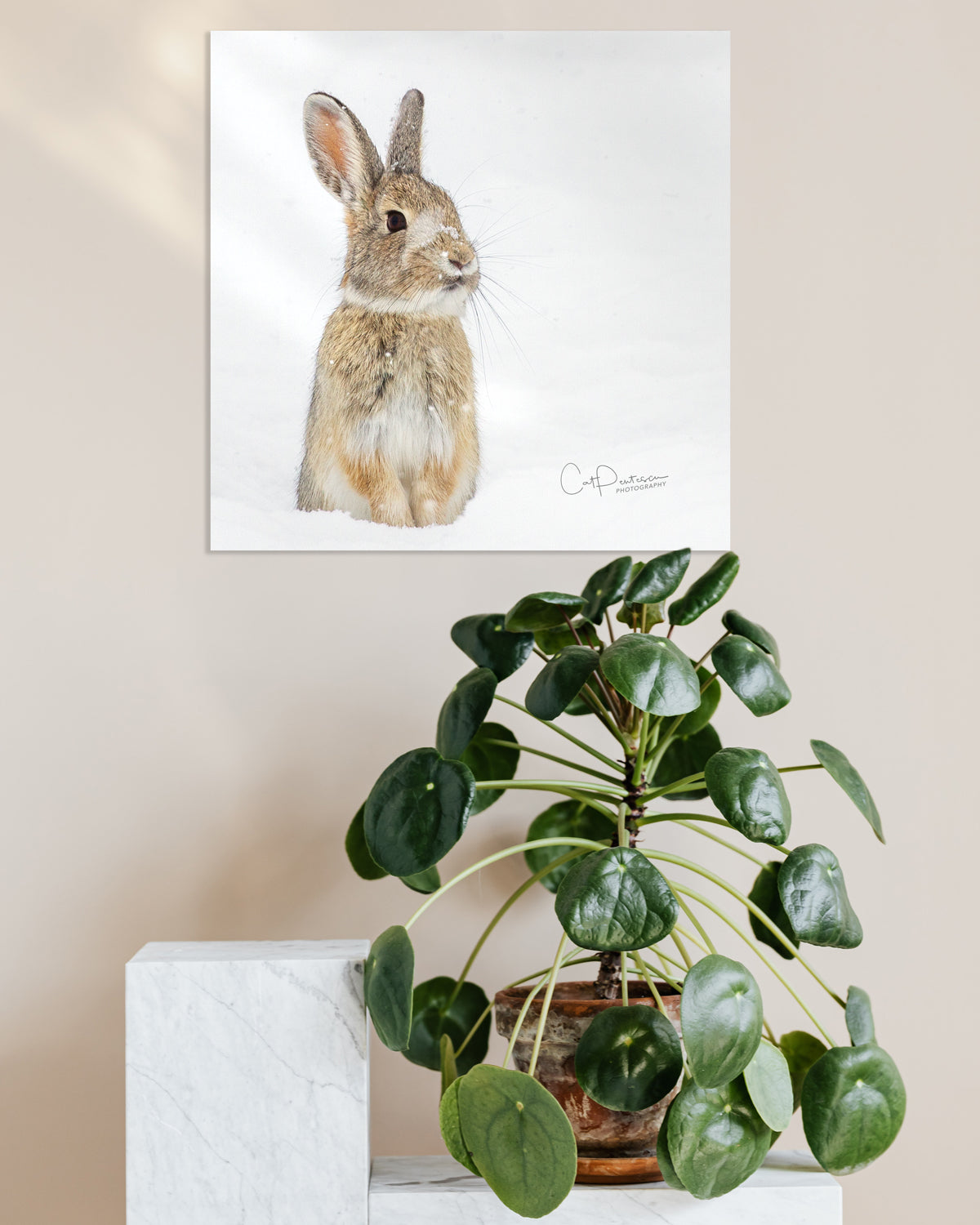 Wild bunny in a snowstorm. Just too cute! Hang him in a living room, nursery or even a waiting room, with his friends or all alone. Taken by Nature and Wildlife Photographer, Cat Pentescu.