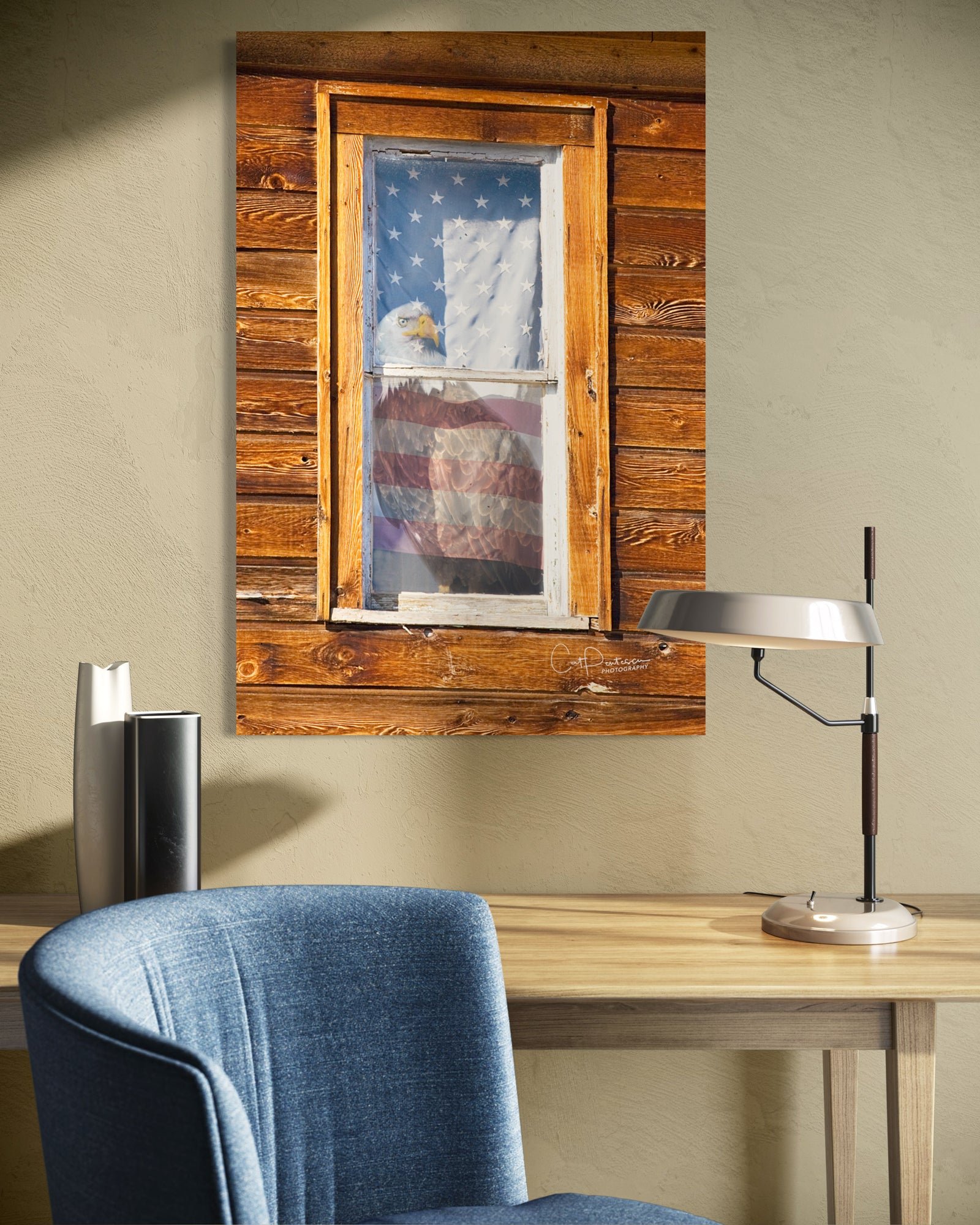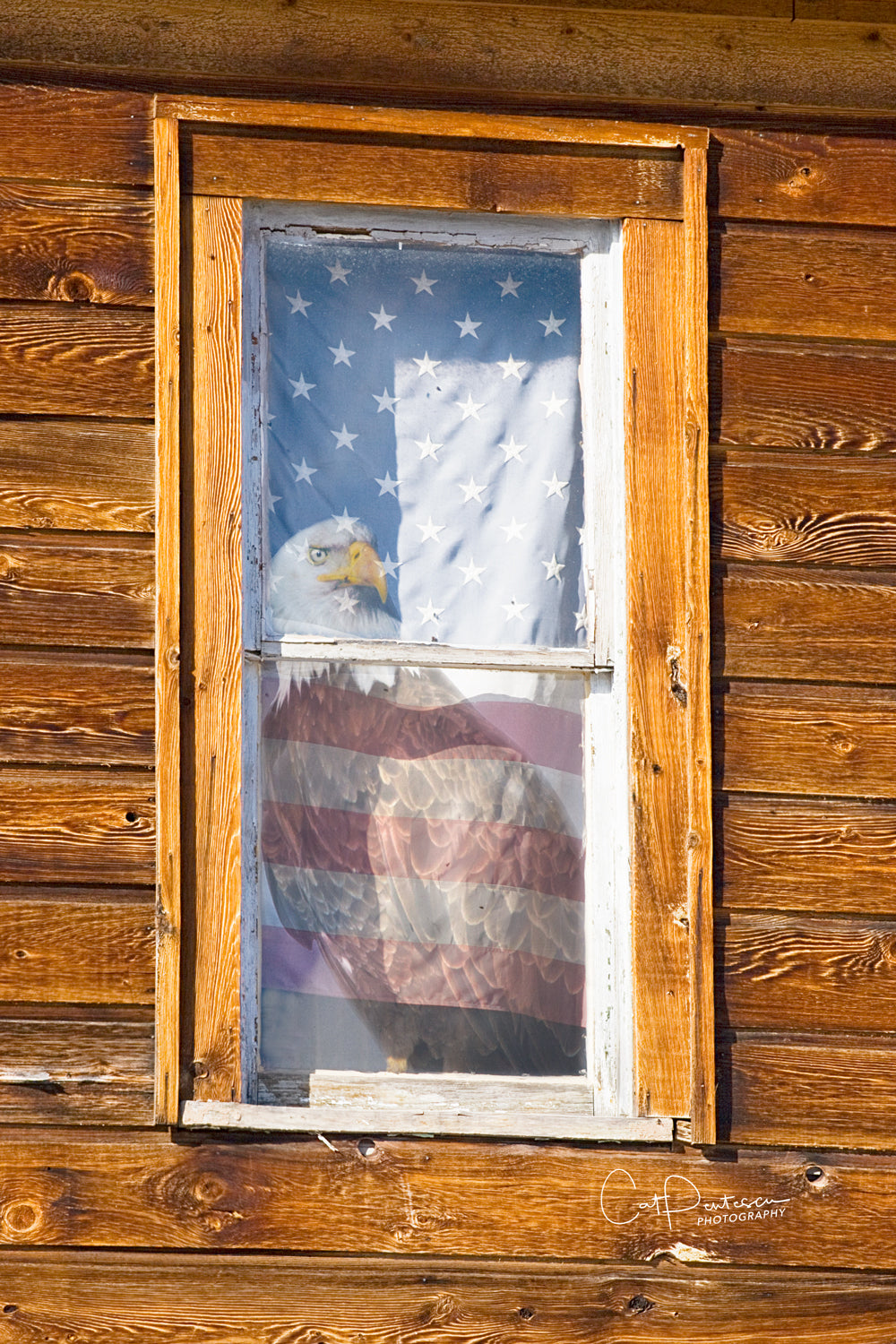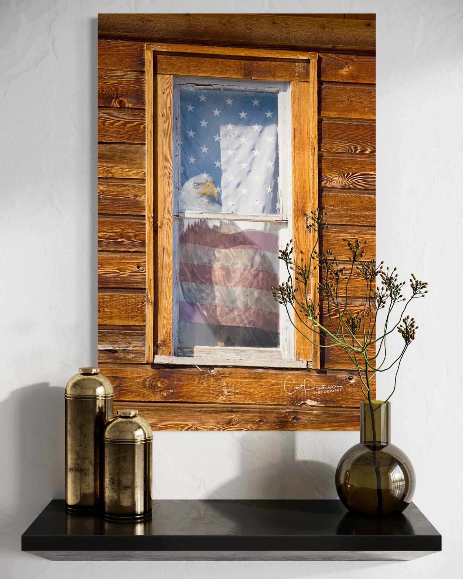 America's symbol of freedom set in a rural rustic window embraces the pride of the USA.