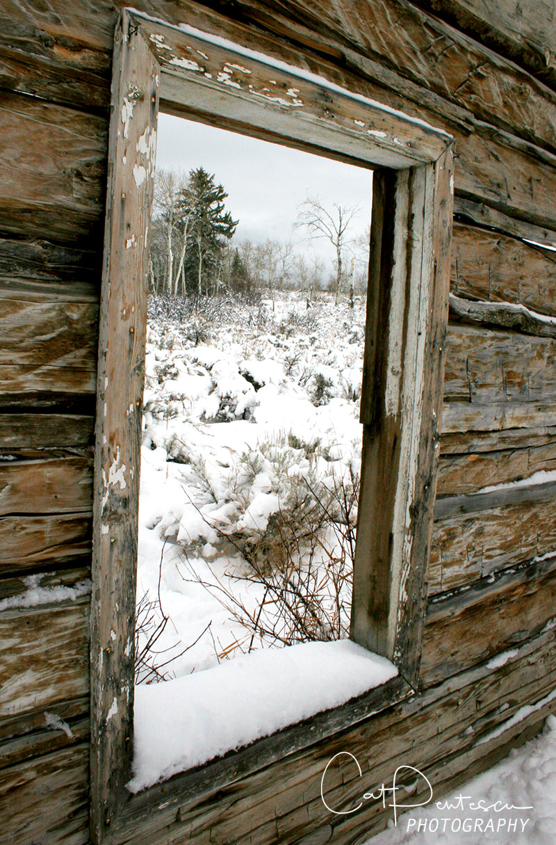 Through a window in the remains of an old log cabin the view is still amazing. Found in Teton Mountains, although the roof is gone, many of the walls are still standing with the cabin's history and secrets inside.