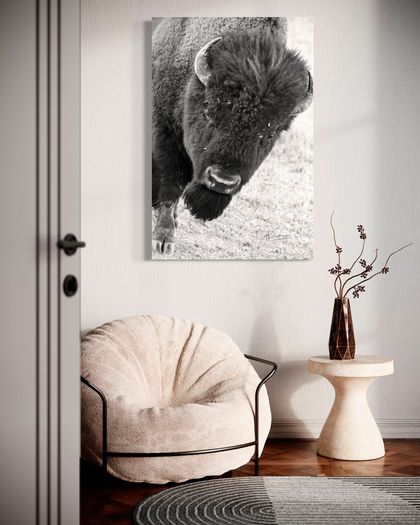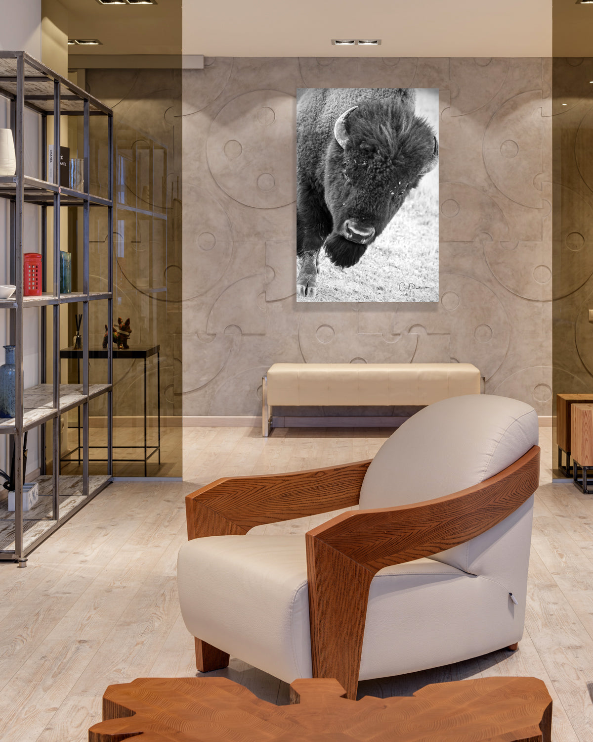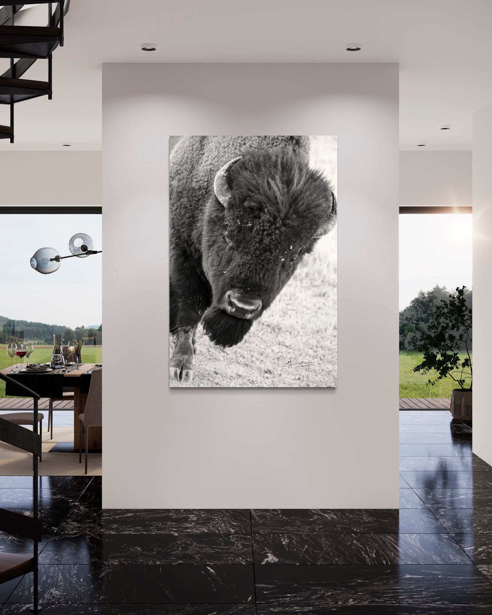 Metal Prints are the "new Canvas". What makes Too Close even more unique is that a special technique is used to drop all the true white out of the image during the printing process, leaving the aluminum shining through. This look cannot be achieved on any other medium and really makes this buffalo stand out on any wall.