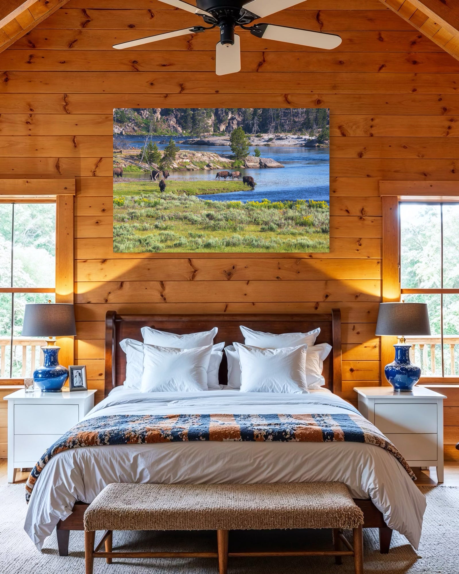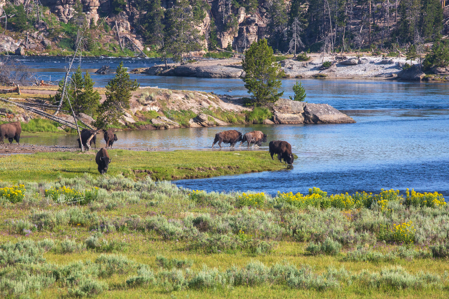 As I stood near the river's edge watching this surreal scene, my heart felt the power that nature offers. The buffalo roam freely, drinking from and walking in the cold mountain river, while others were grazing on the lush summer grasses. For the moment, there was peace along the riverbank and in my heart.