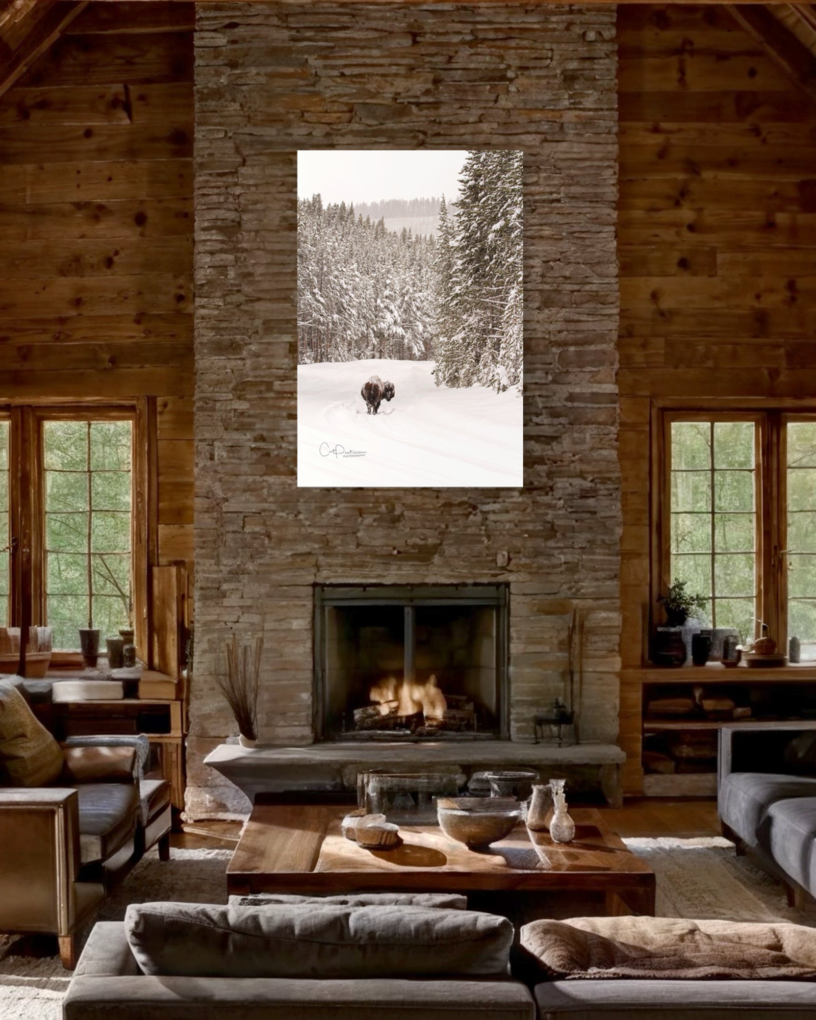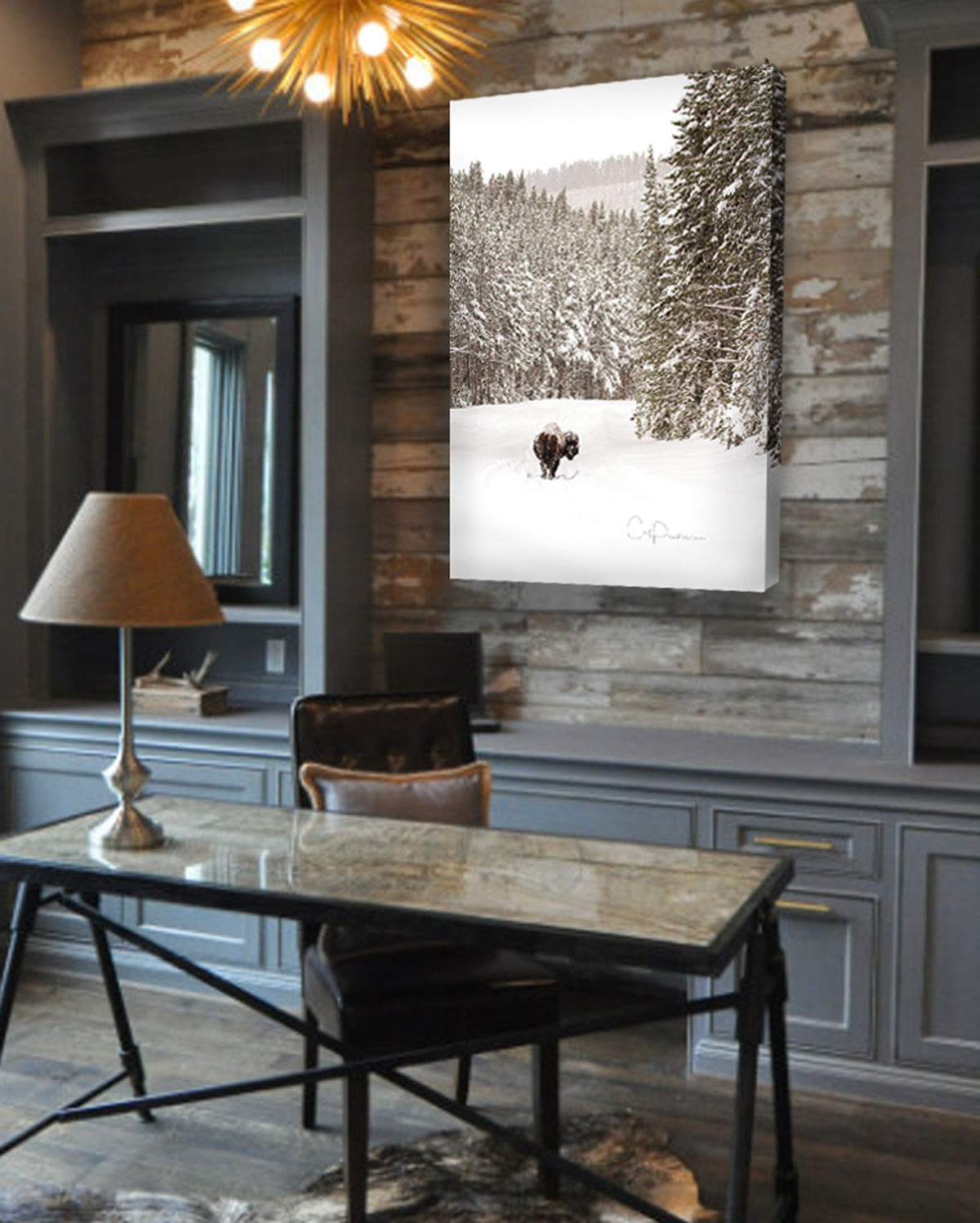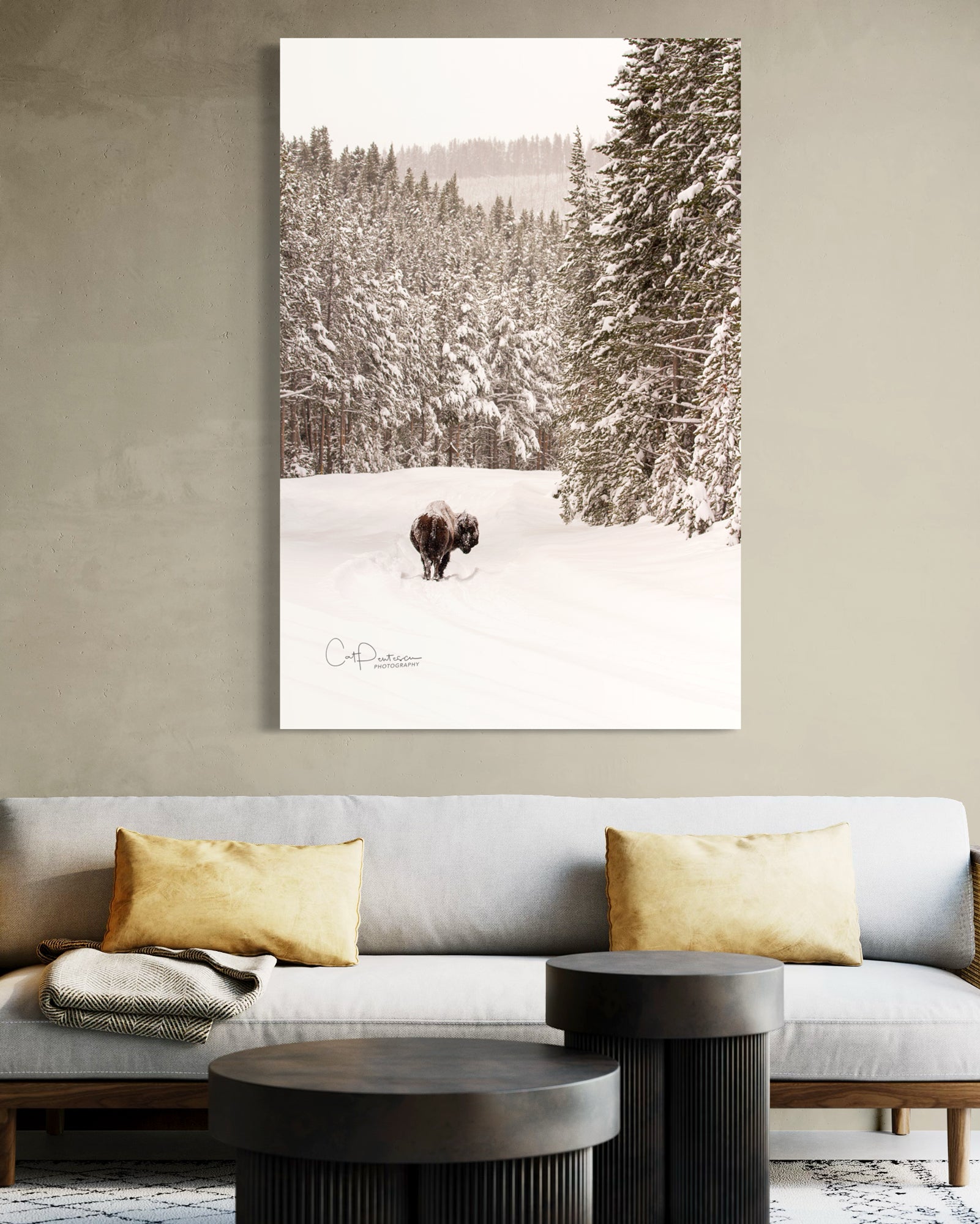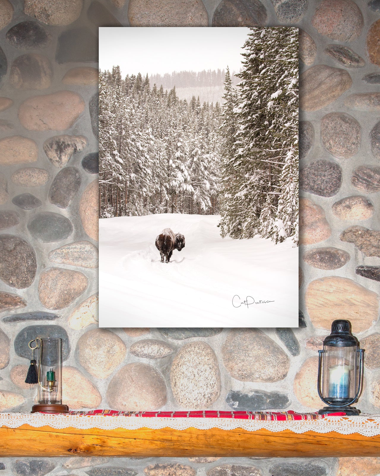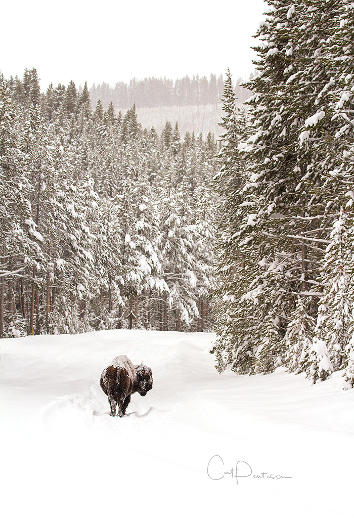 Peace and tranquility meets wildlife when the road is closed. The first of four bull Buffalo to made it out of the deep snow in the NW Wyoming wilderness to the closed road.