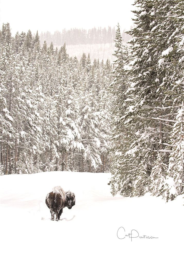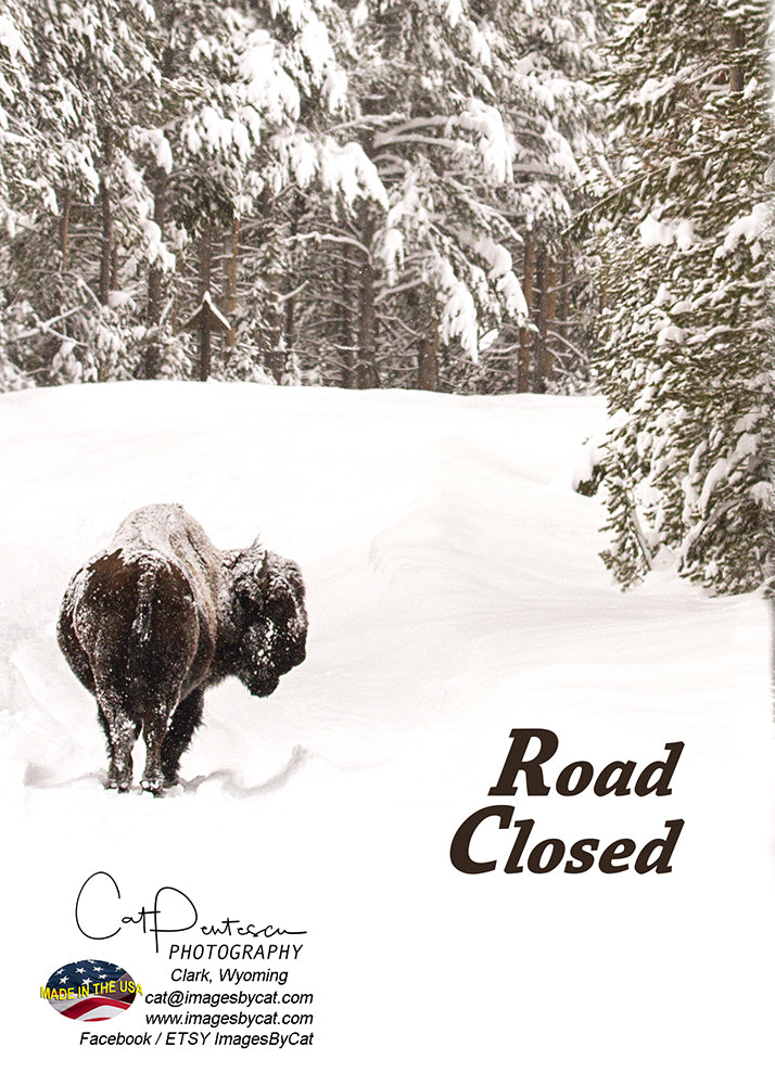 Peace and tranquility meets wildlife when the road is closed. The first of four bull Buffalo to made it out of the deep snow in the NW Wyoming wilderness to the closed road. This 5"x7" full color greeting card is blank inside to write your message.