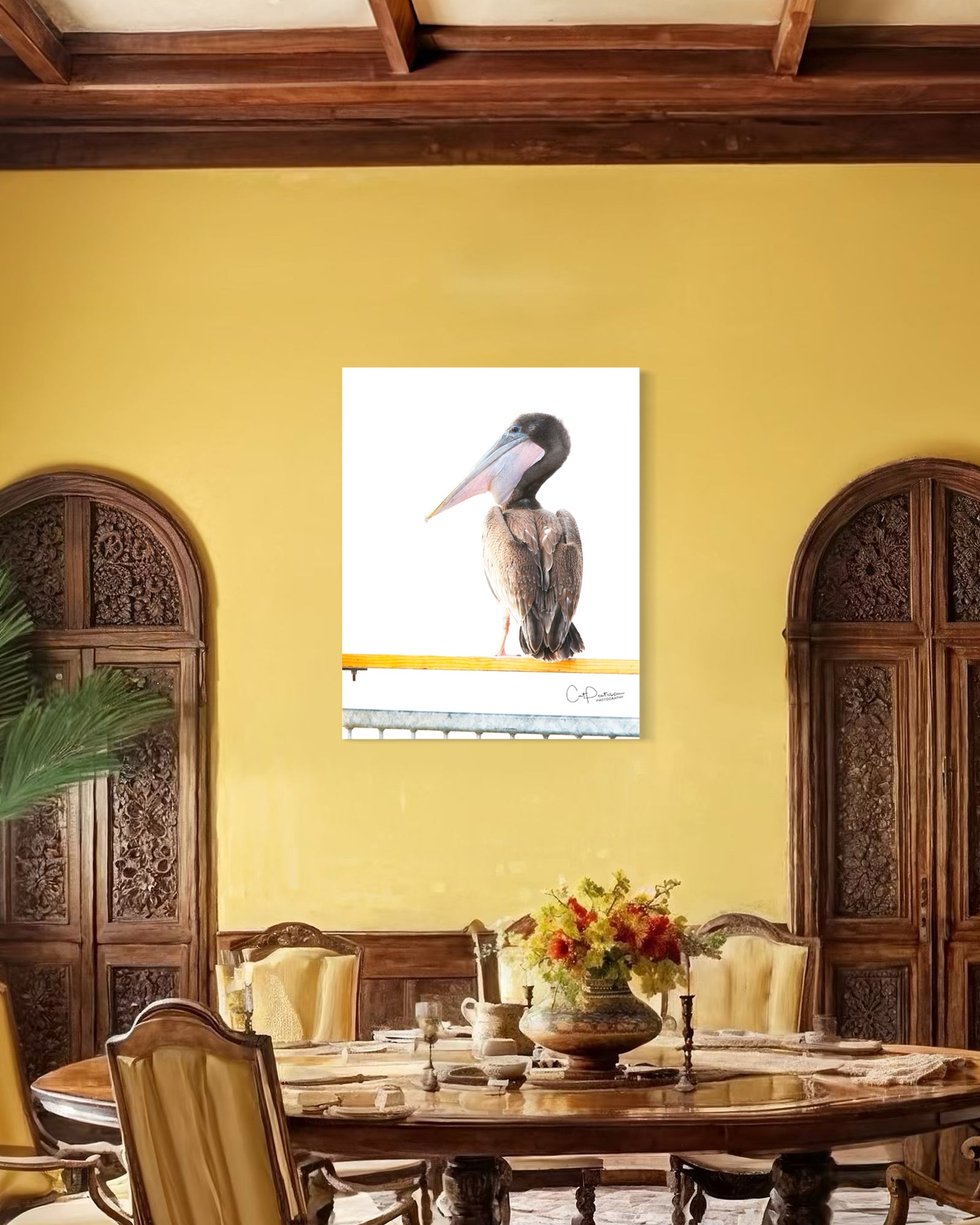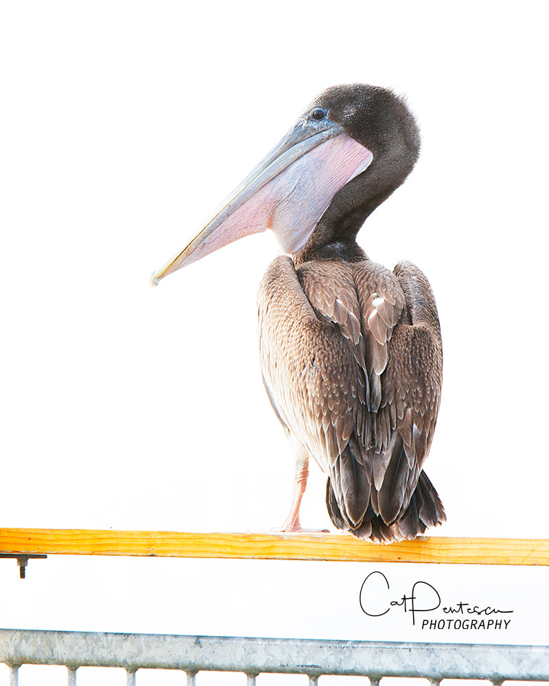 Amazing detail in this simple and uncluttered photo of a brown pelican on a railing.