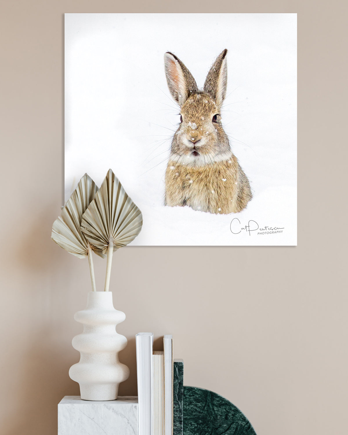 Wild bunny in a snowstorm. Just too cute! Hang him in a living room, nursery or even a waiting room, with his friends or all alone. Taken by Nature and Wildlife Photographer, Cat Pentescu.