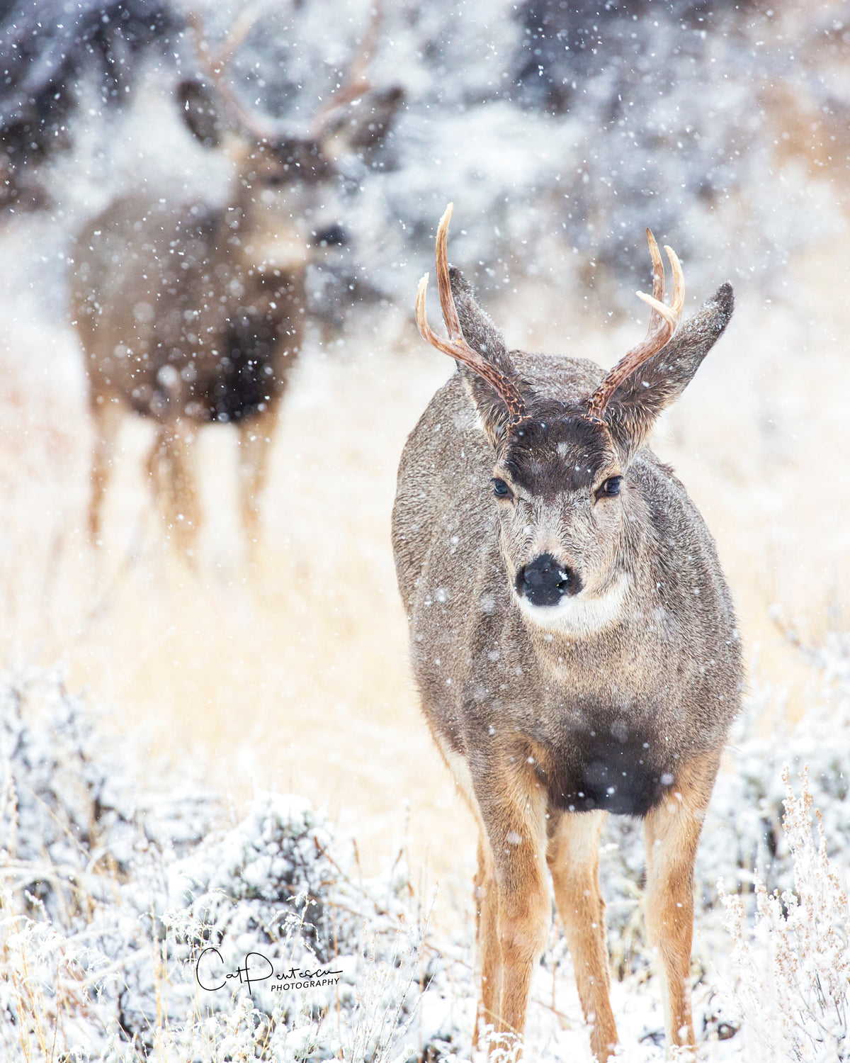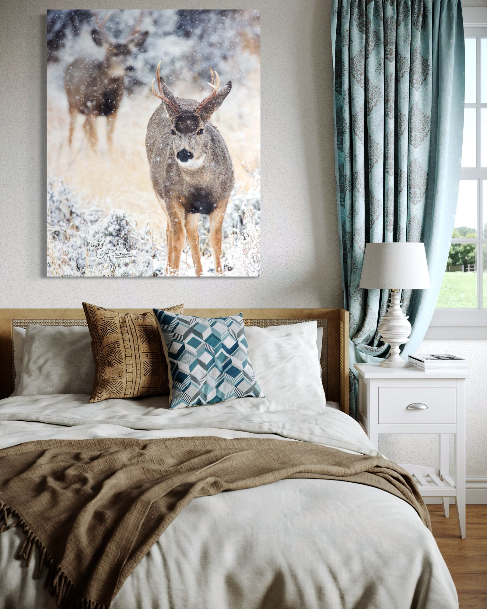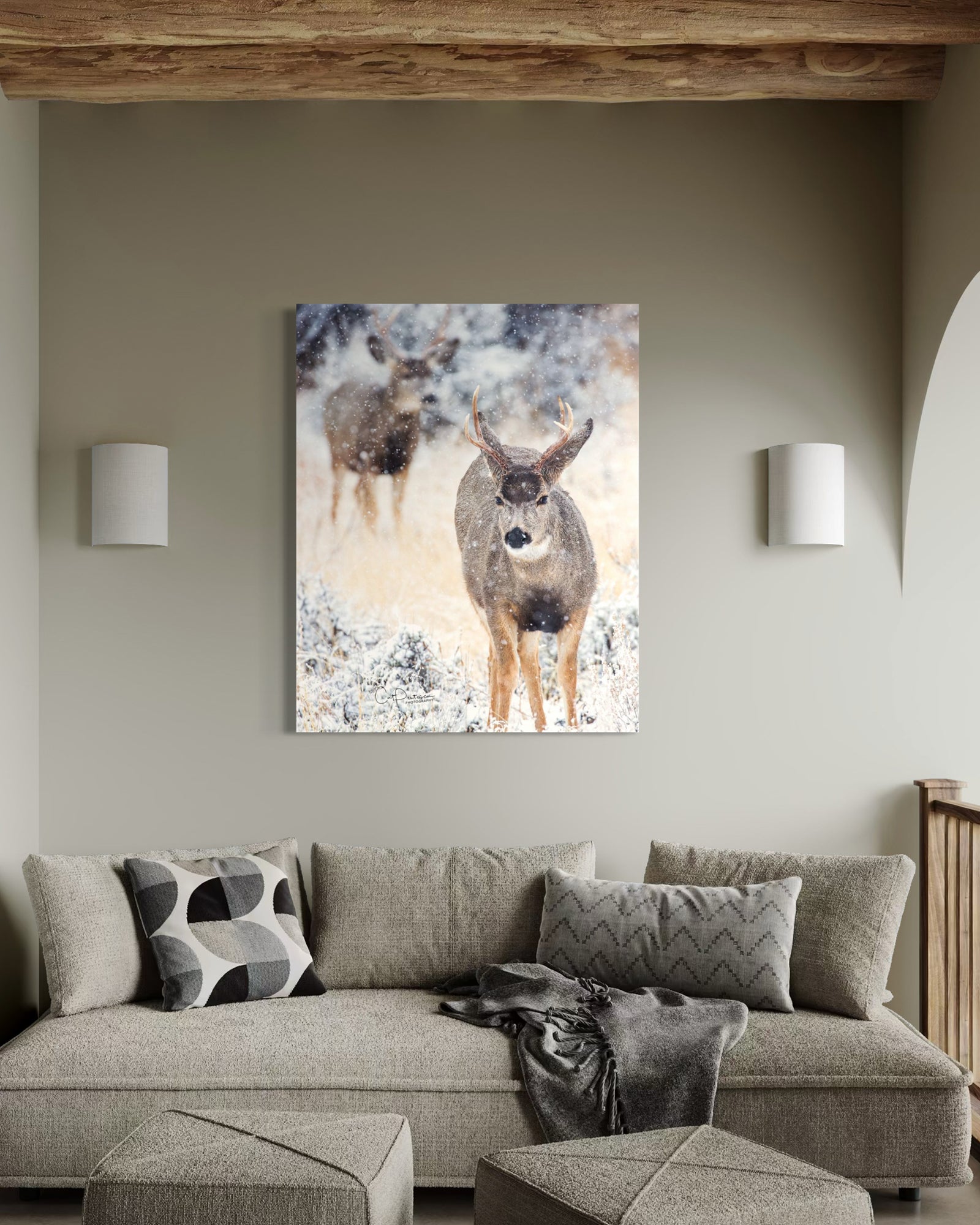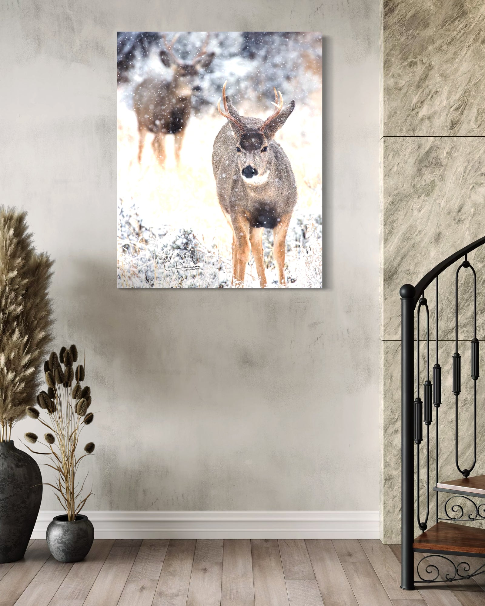 Survival in the wild means bearing whatever Mother Nature throws at these mule deer as they make their way through a heavy snow fall. This is one of those special pieces that looks more like a painting than a photograph. It tells a story, the depth of feeling is deep, the depth of field is not making it beautiful and inspiring. Now available on canvas, metal or as a paper print. This stunning piece of art was taken by Nature and Wildlife Photographer, Cat Pentescu and is sure to make an impact on your wall.