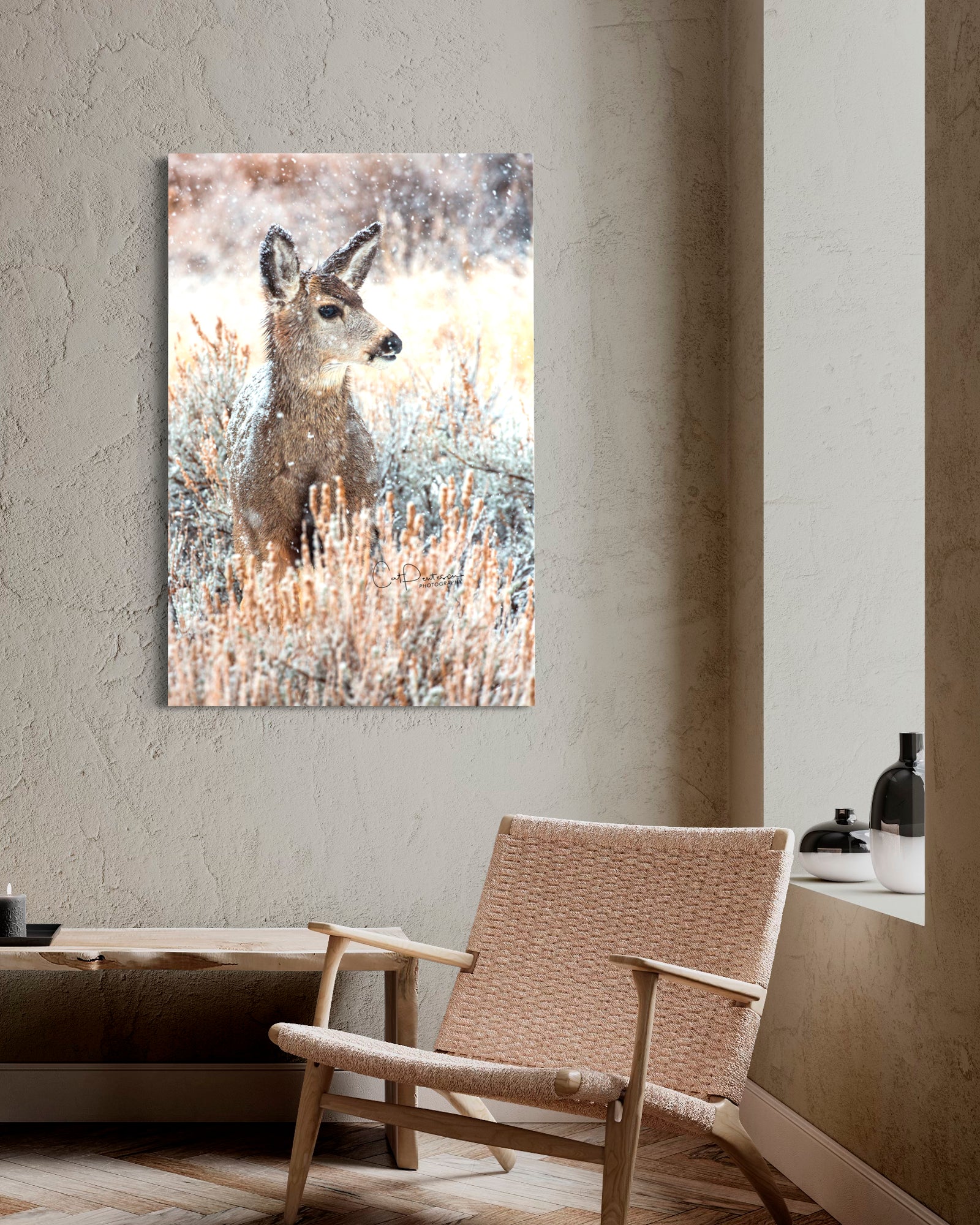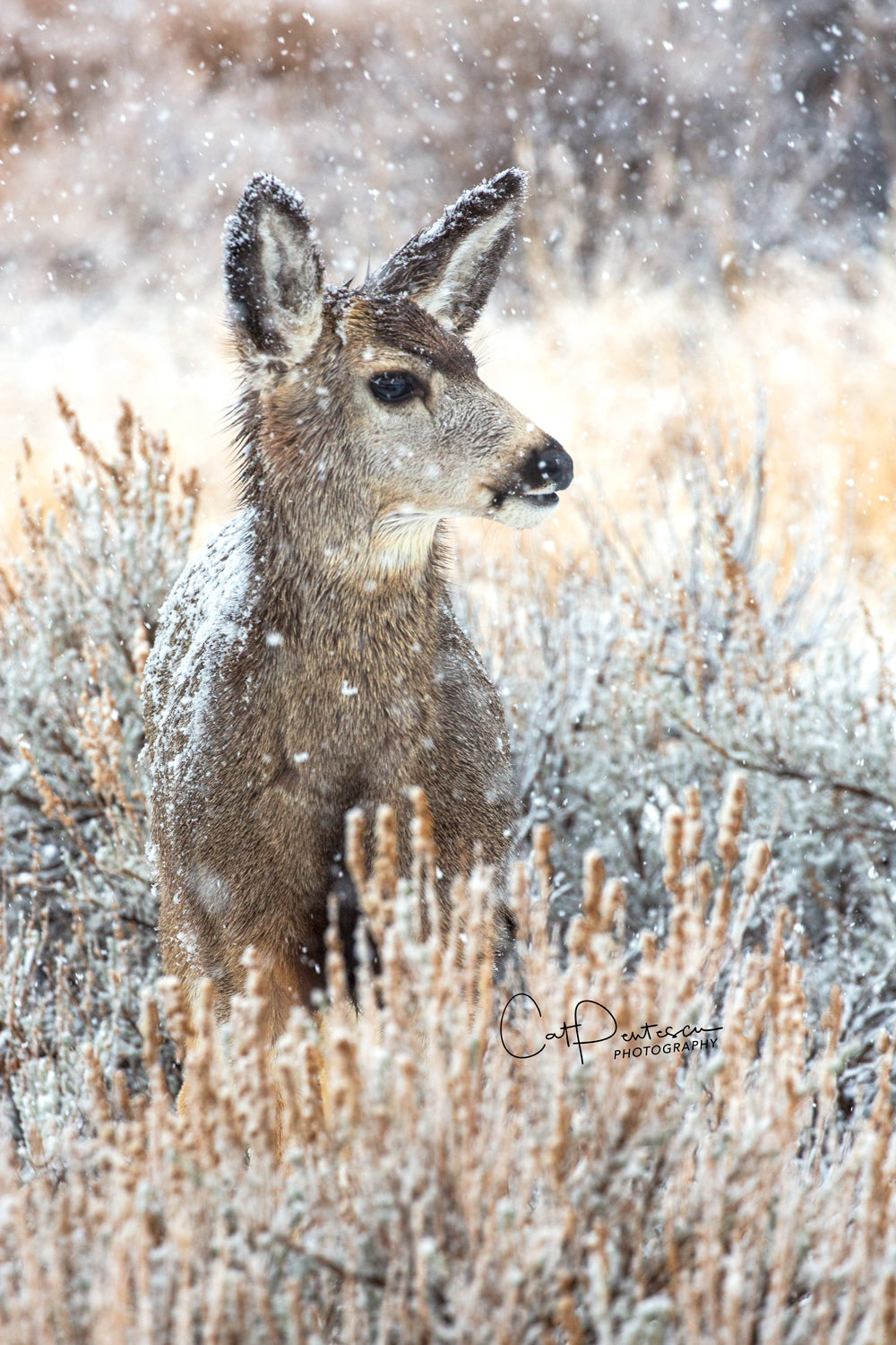 "The silence is deafening as falling snow magically spreads a cold blanket over the earth. " Came across this beautiful mule deer doe as she stood in the silence of winter.