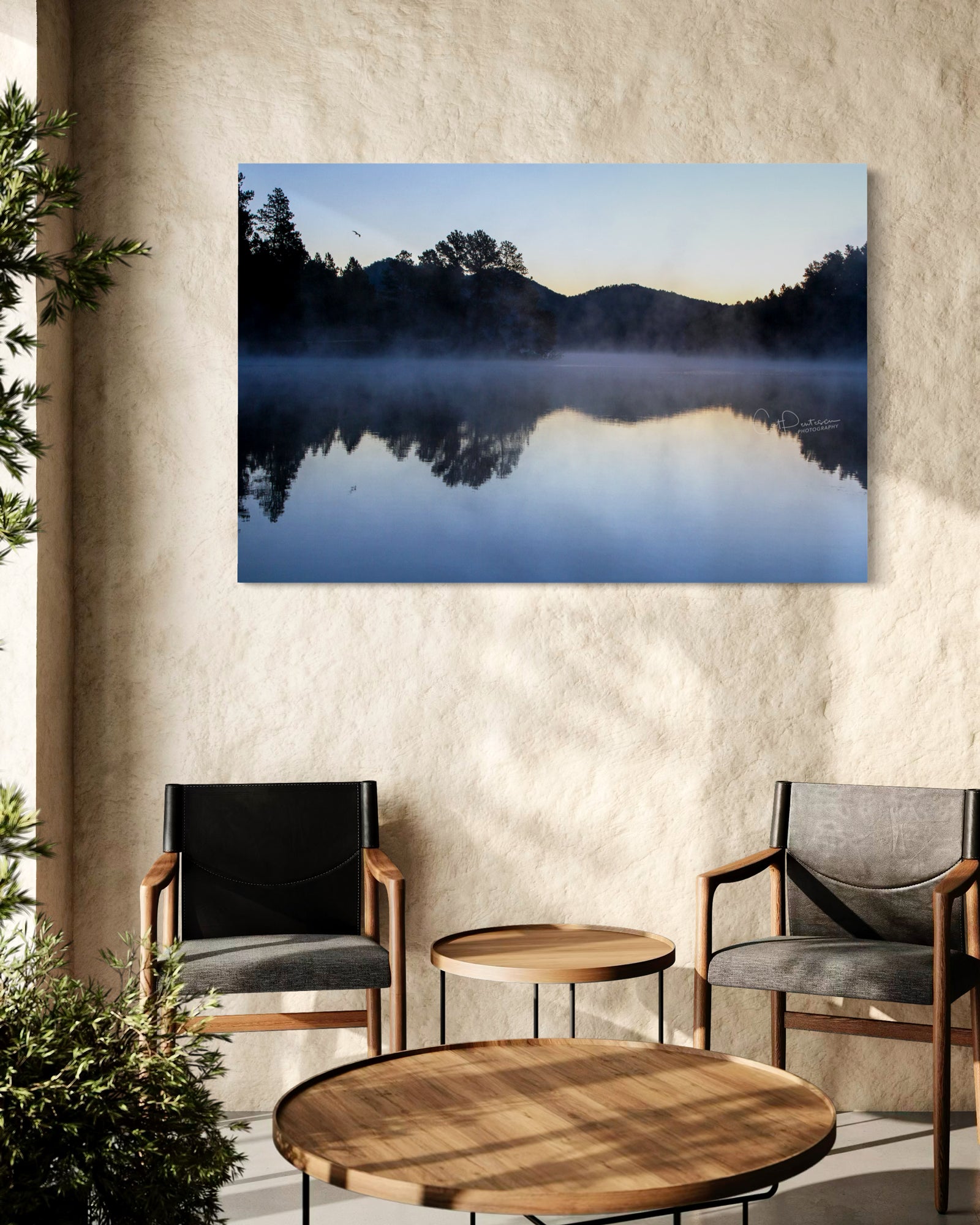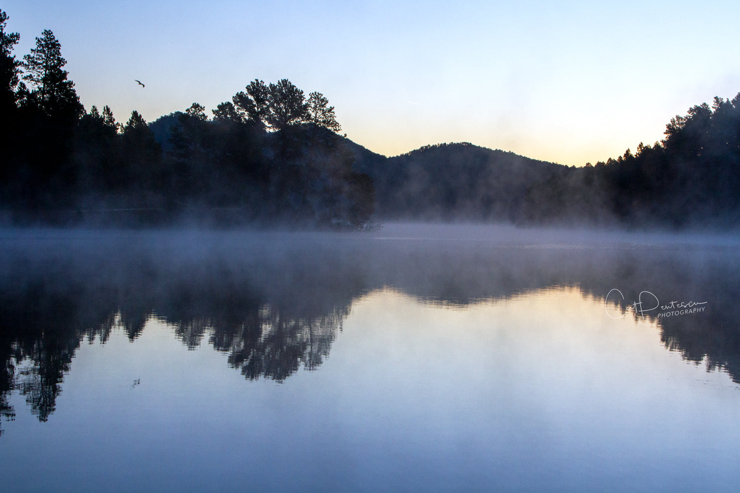 Calm and quiet. As the sun comes up the chill in the air leaves with the darkness. Only the lake remains cold as it vaporizes into mist on the water.