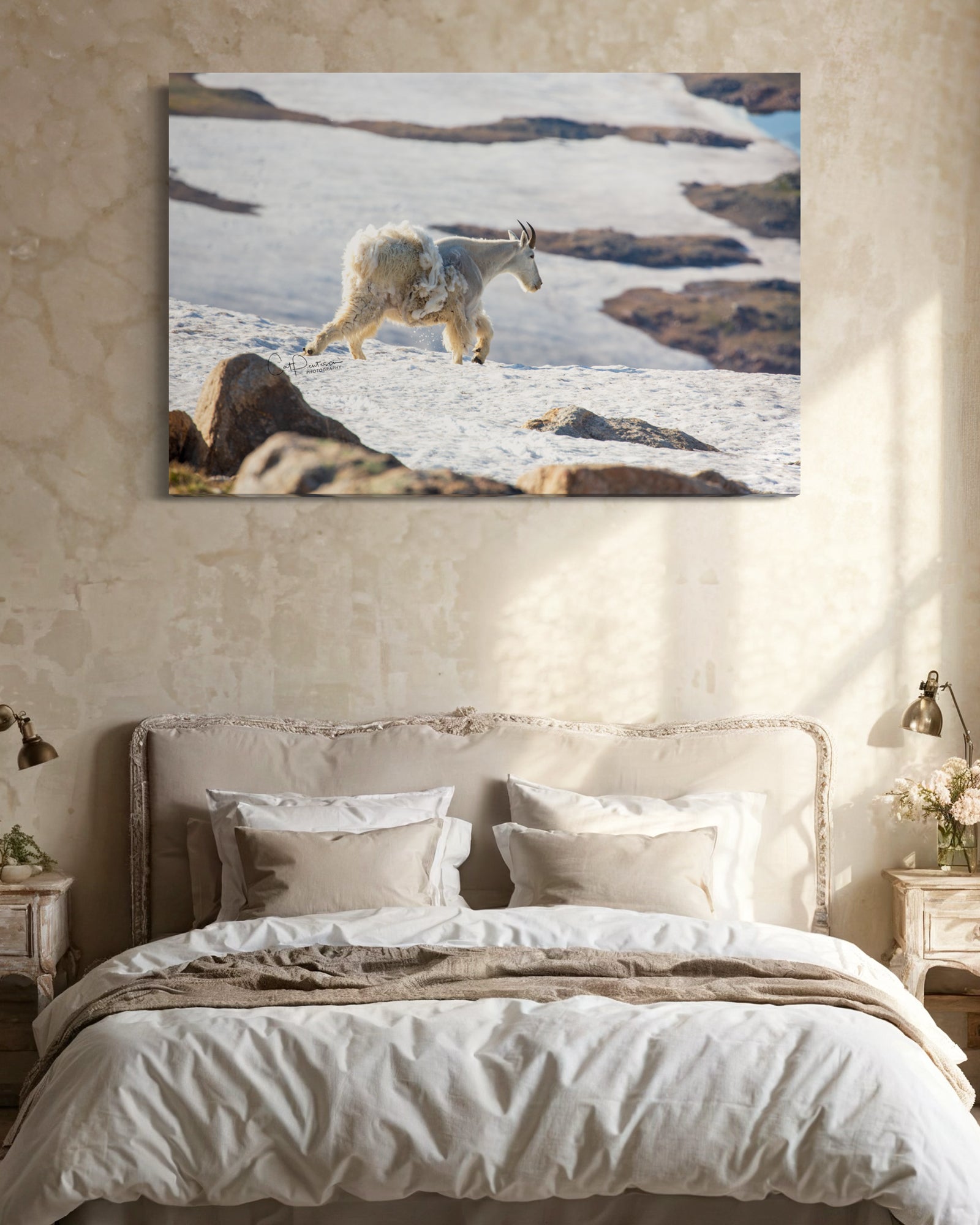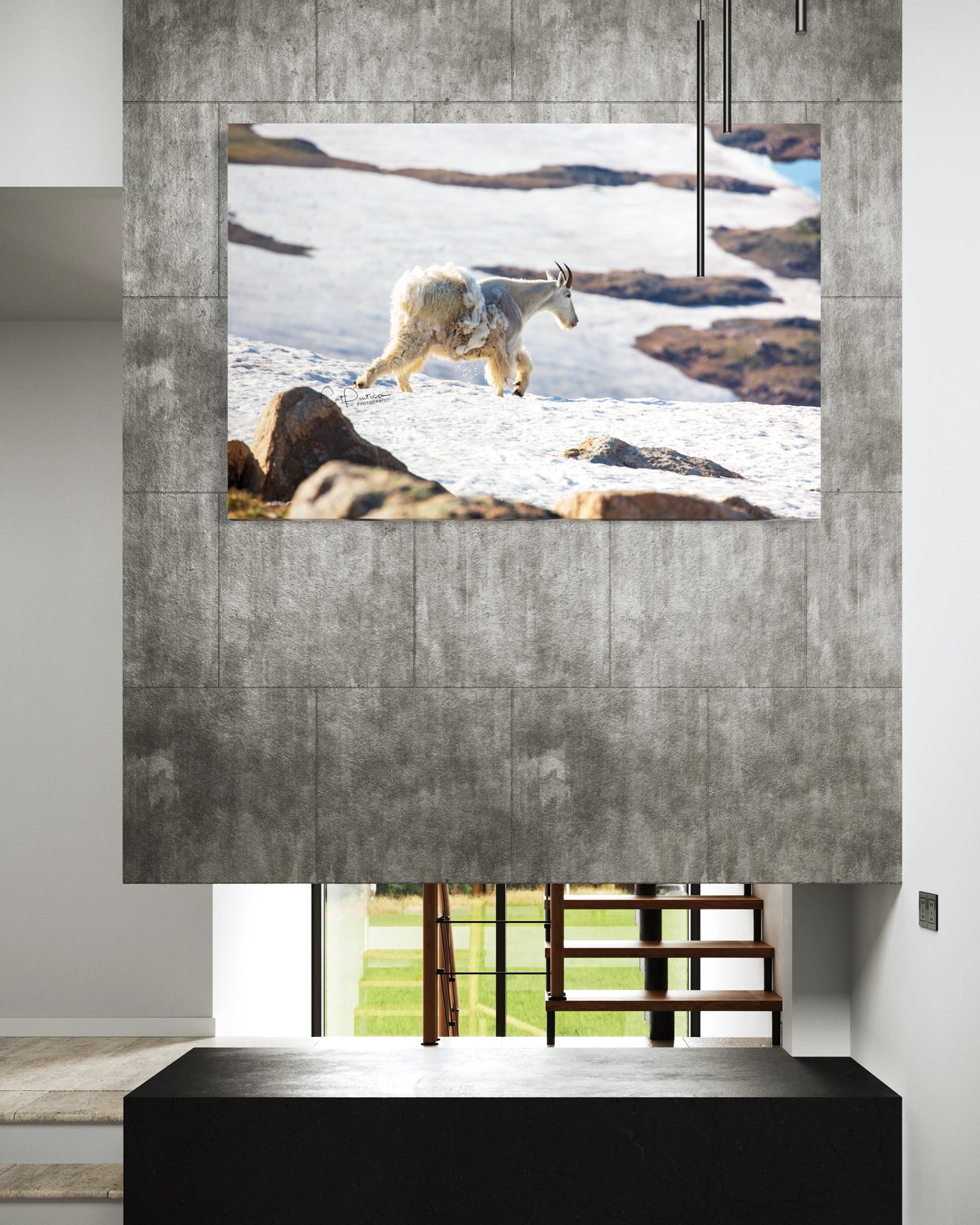Mountain goat leaving tracks in the snow at the top of the world along the Beartooth Highway.