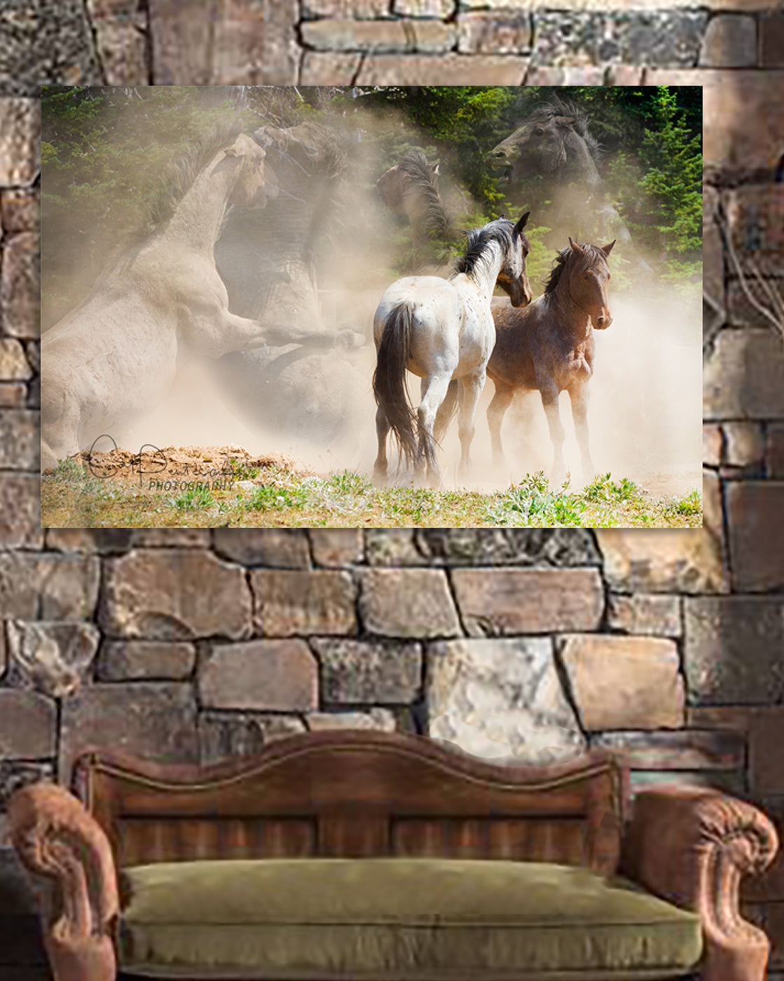 Two wild horses in the Pryor Mountains were having a bit of a battle. This piece is created with three of my photographs of their encounter. By incorporating the three photos, fading of the two images of the same two horses fighting into the dust of the third image, the finished piece is quite unique as it tells the whole story.