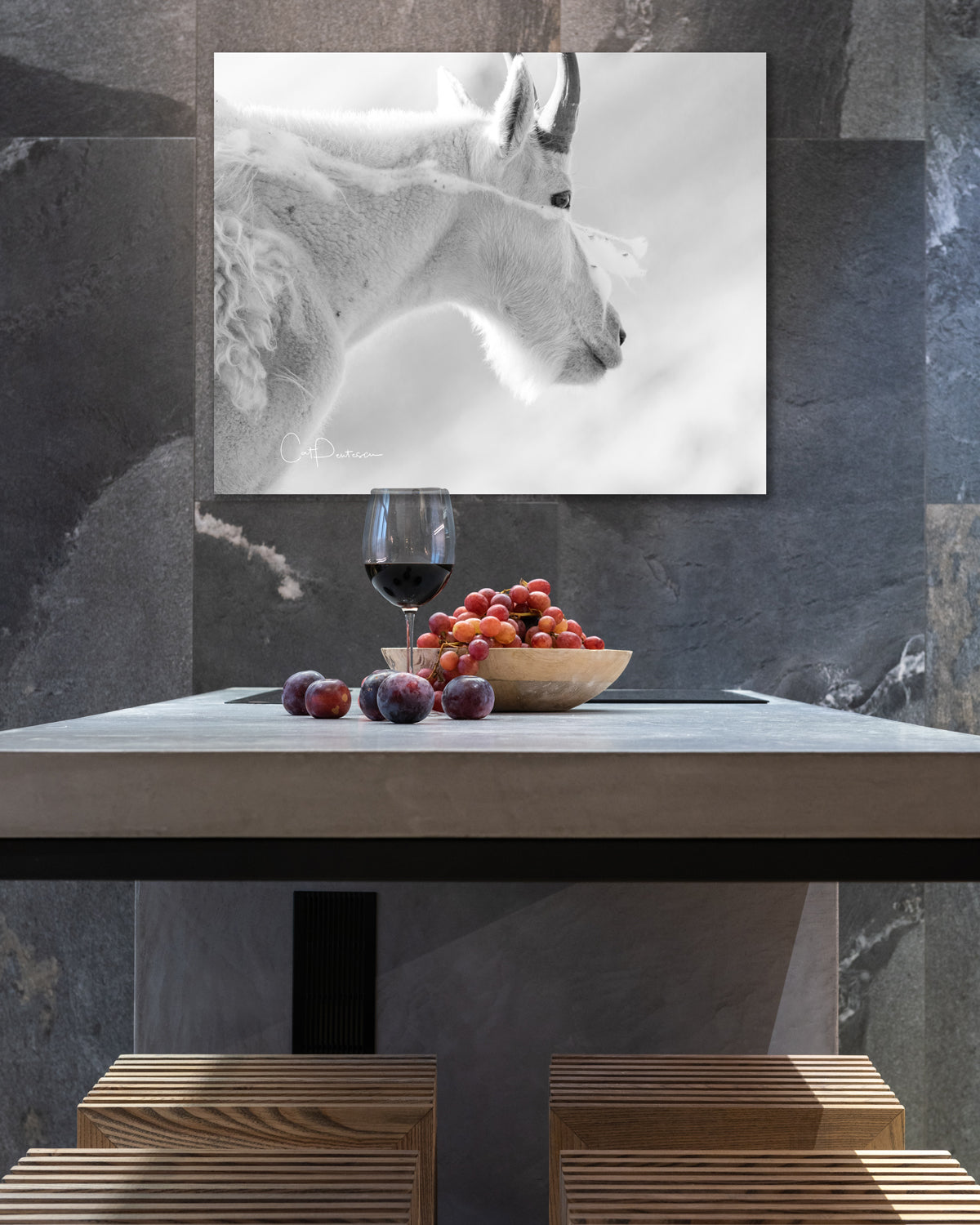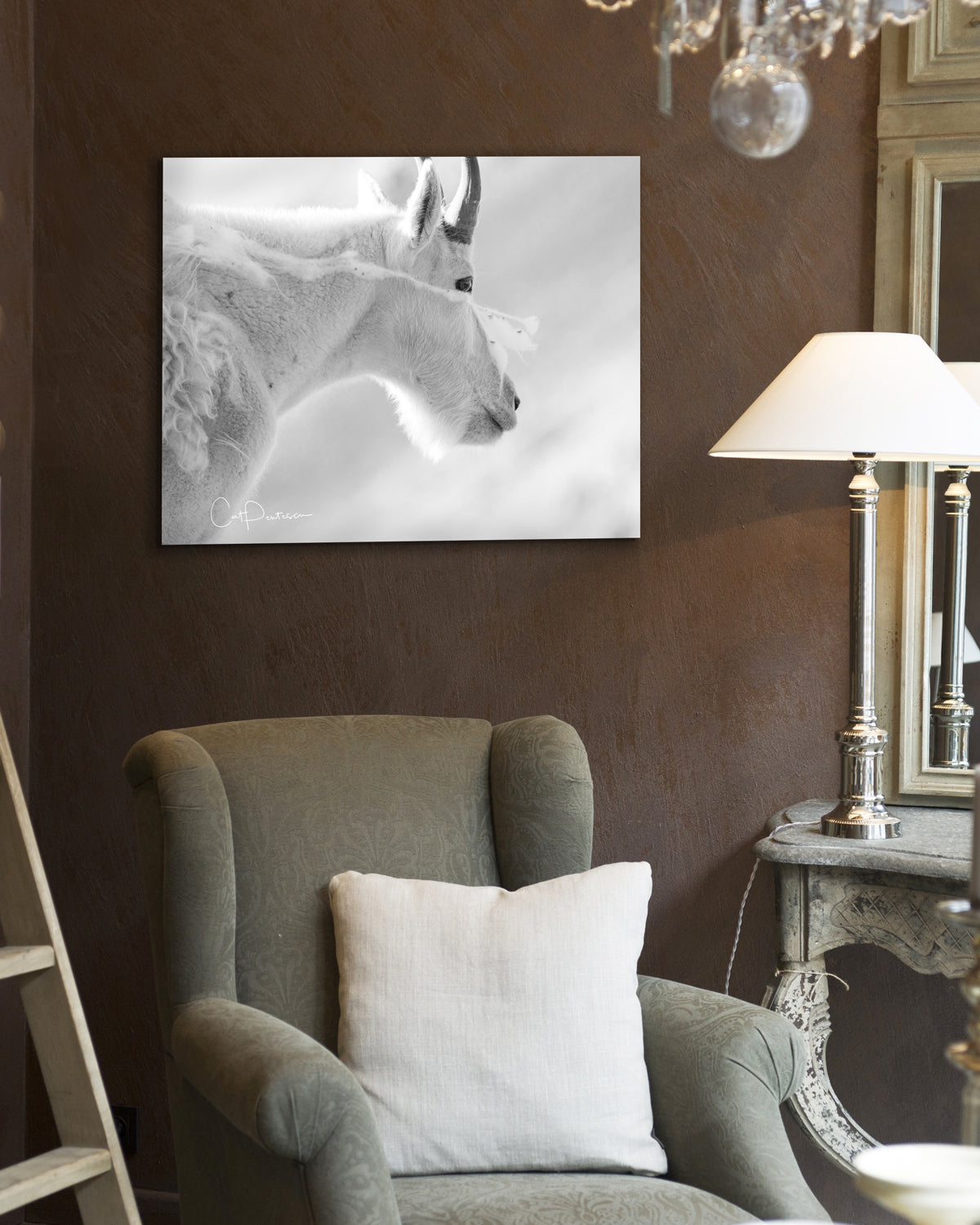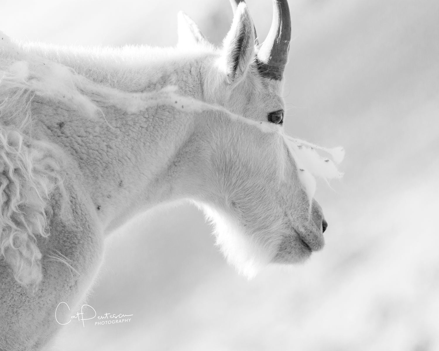 This black and white image of a mountain goat is timeless as the mountain breeze blows his winter fur across his face in the late afternoon sun.