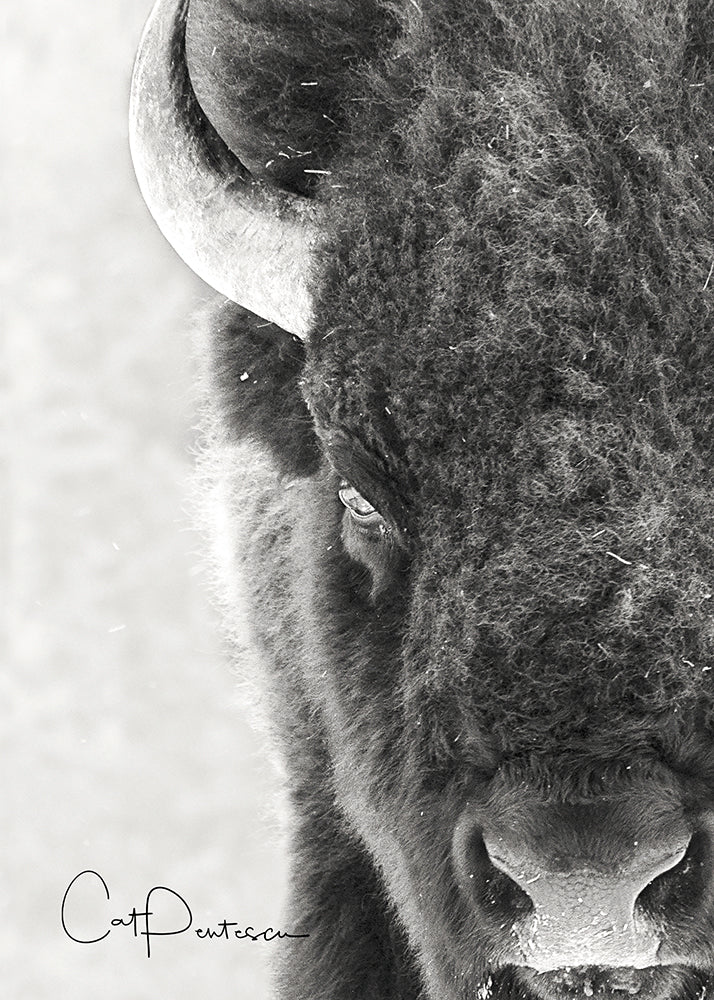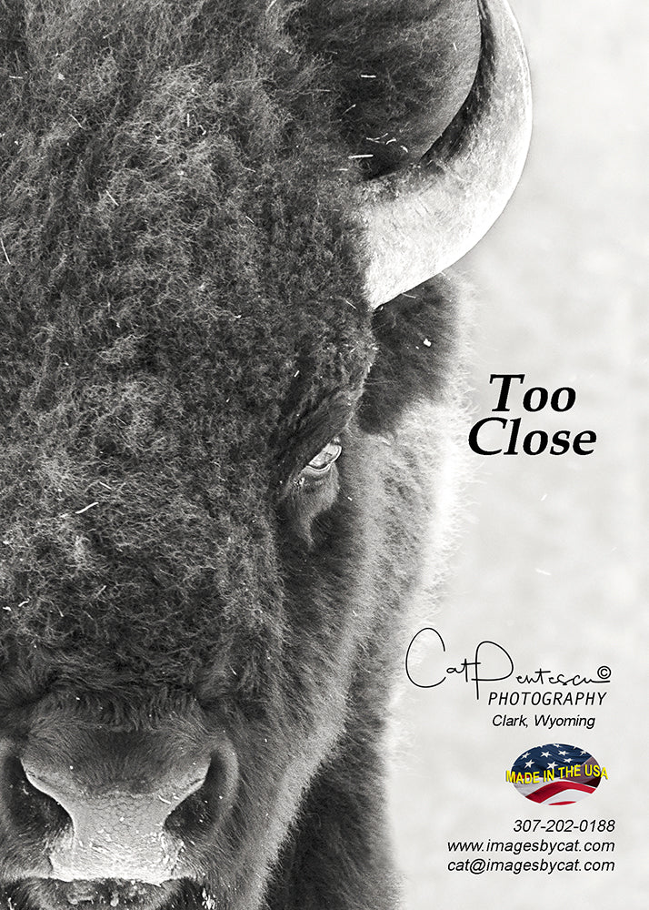 Too Close is a very edgy, strong and unique piece of art that you need to see to really appreciate. It it a black and white image of a massive Buffalo / Bison's head. Taken in NW Wyoming. This 5"x7" full color greeting card is blank inside to write your message.