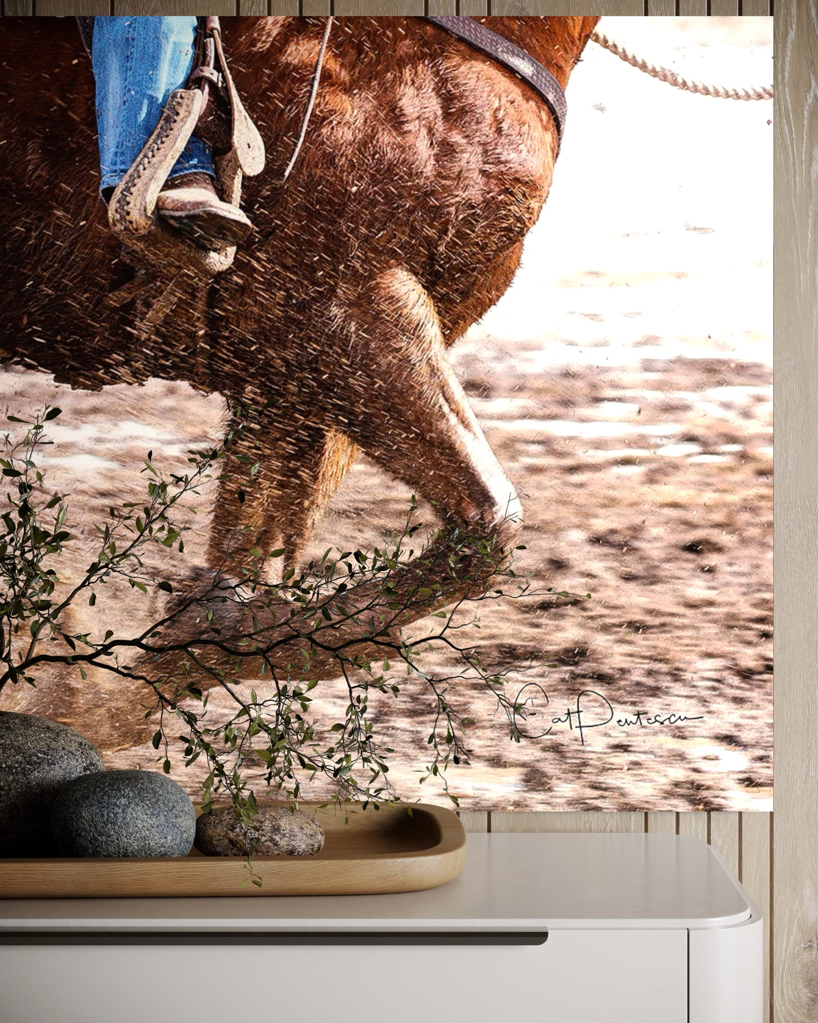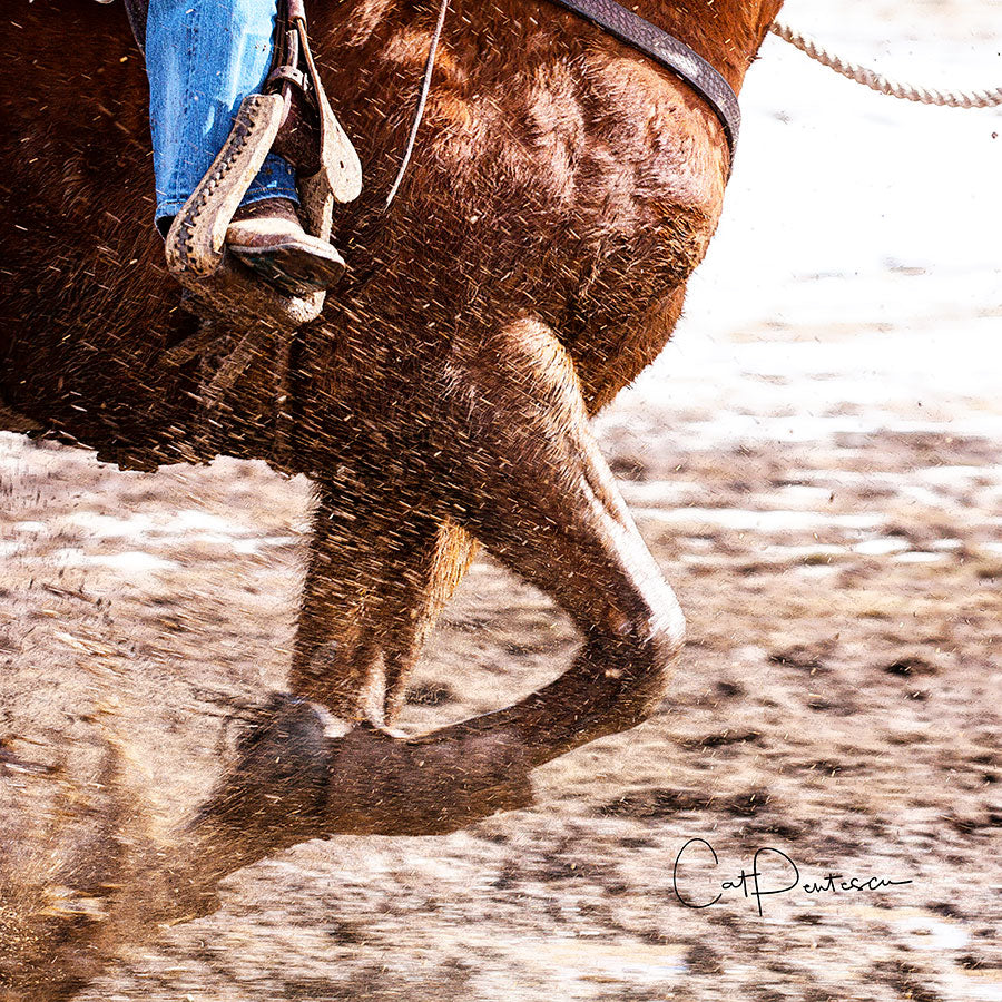 Riding in mud, slush and snow isn't a walk in the park. Add speed and it takes bonded pair - confident rider with a steady and trusting horse to stay upright and make it through. Powerful enhanced photo creating a very artistic image of speed and endurance.