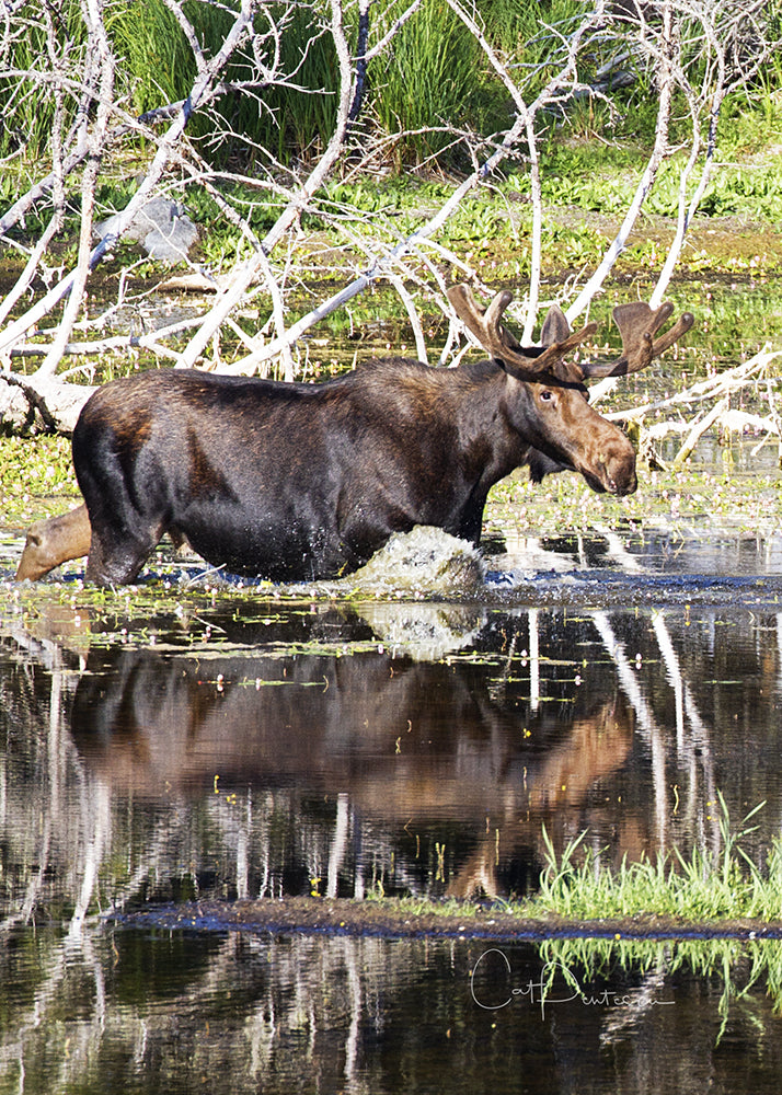 Big bull moose with paddles still in velvet pushing the water as he walks through Swamp Lake in NW Wyoming. This 5"x7" full color greeting card is blank inside to write your message.