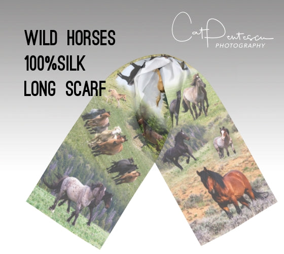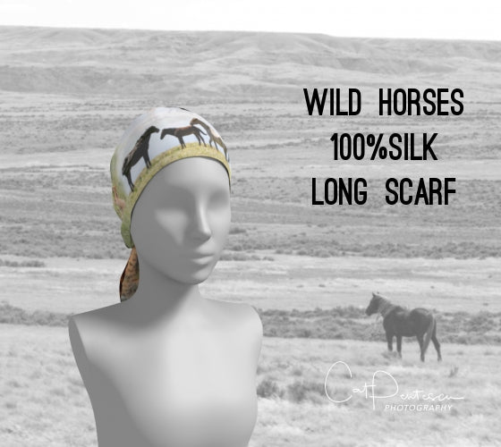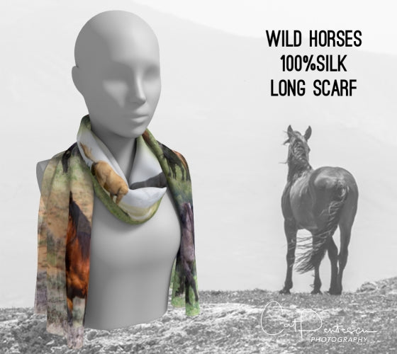 Wild Horses cover this luxurious silk long scarf. At a full six foot long and created with the spirit of wild horses roaming free, this amazing piece of usable art is a must have. Full color images make it versatile enough to wear with any outfit. Keep your wild, even during a night out on the town!