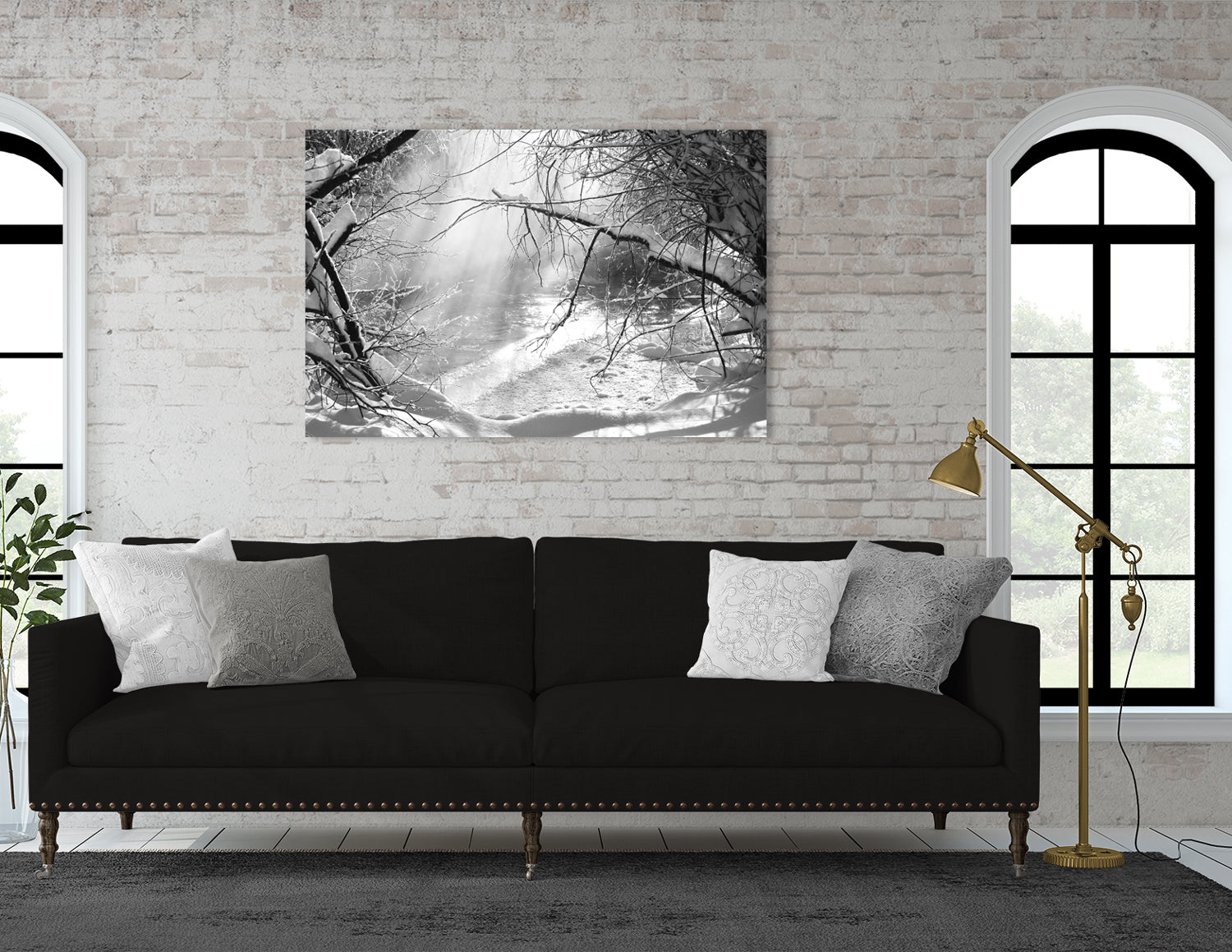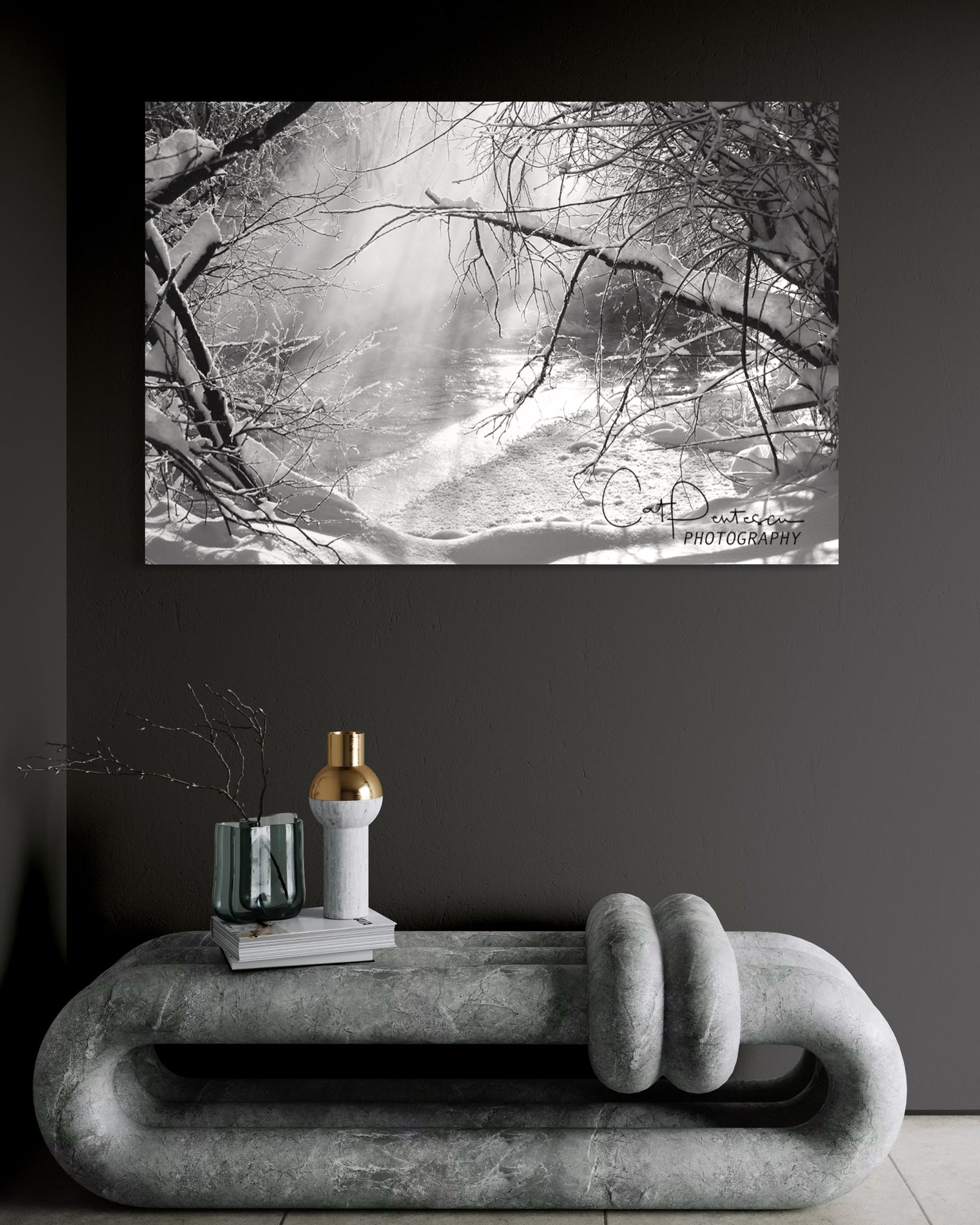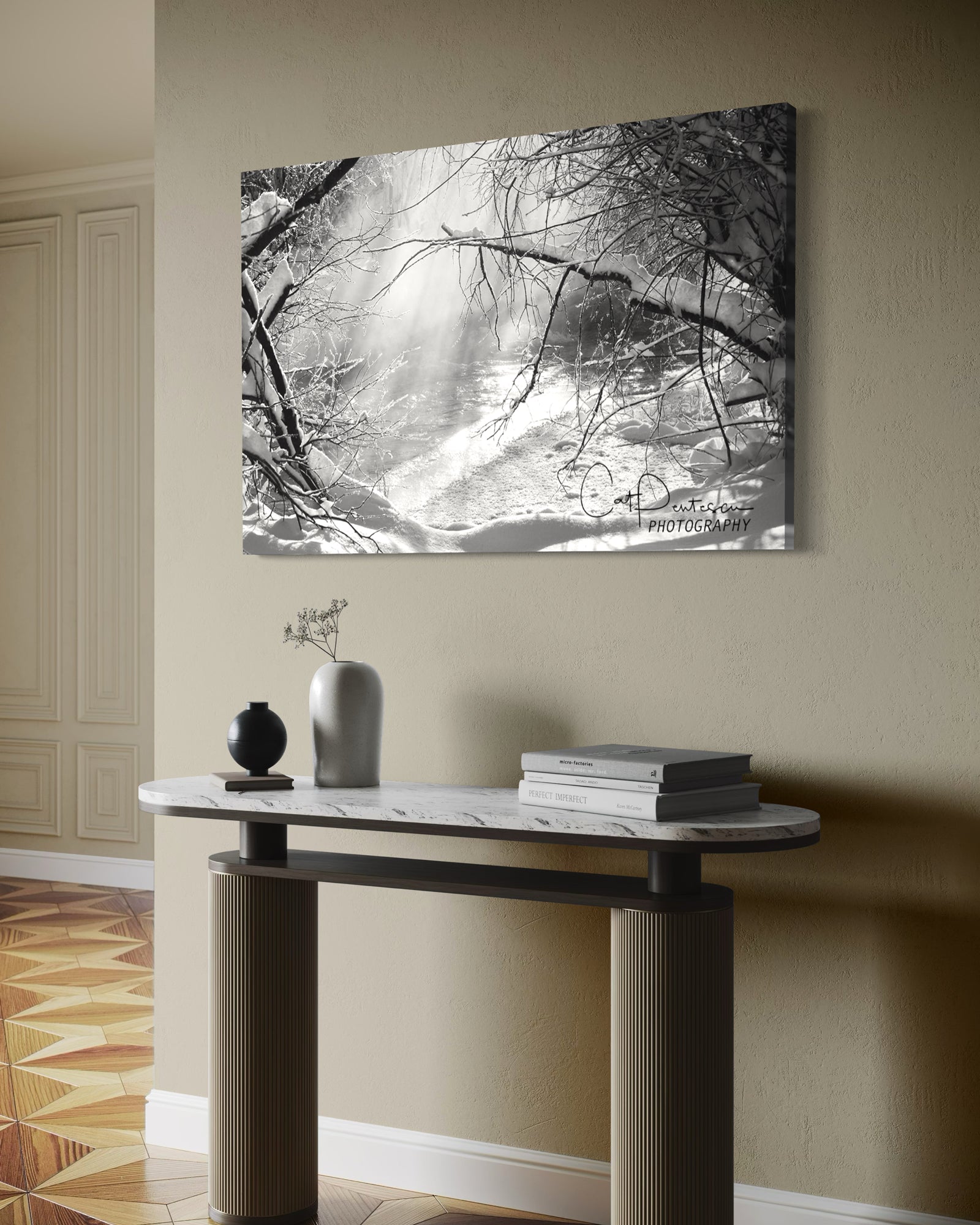 Early morning moving water through the snow and ice as the sun's rays shine through. Fast flowing Little Rock creek rarely freezes even in the harshest of winters, creating intriguing scenes such as this taking you into Wyoming's wild winter!