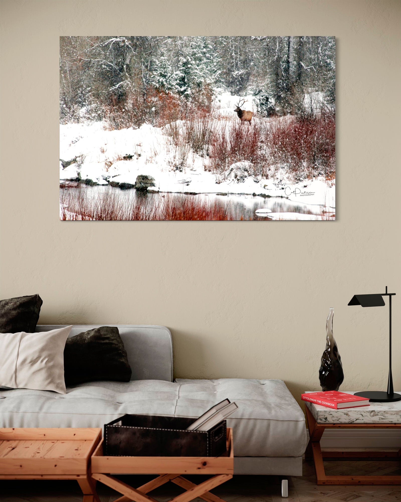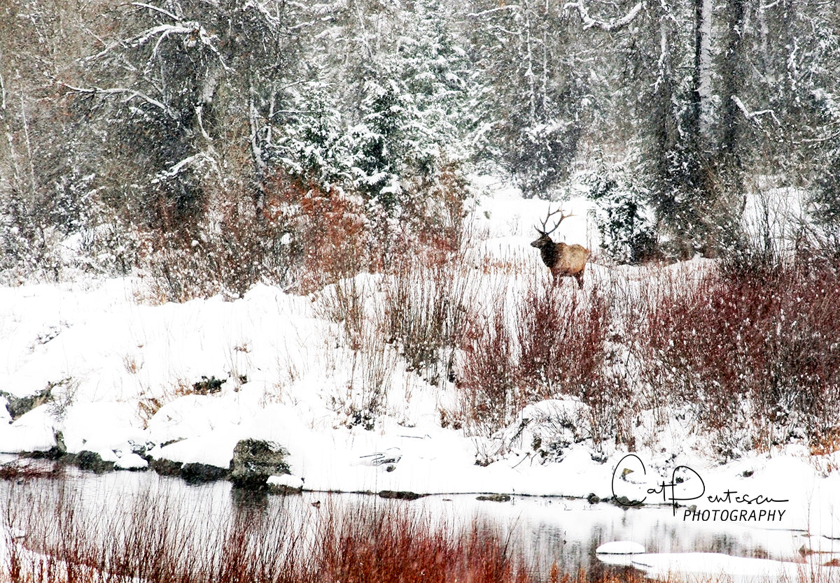 The mountains are a place full of solitude, peace and wildlife during the harsh Wyoming winters. A bull elk stands alone in snow storm by the river.
