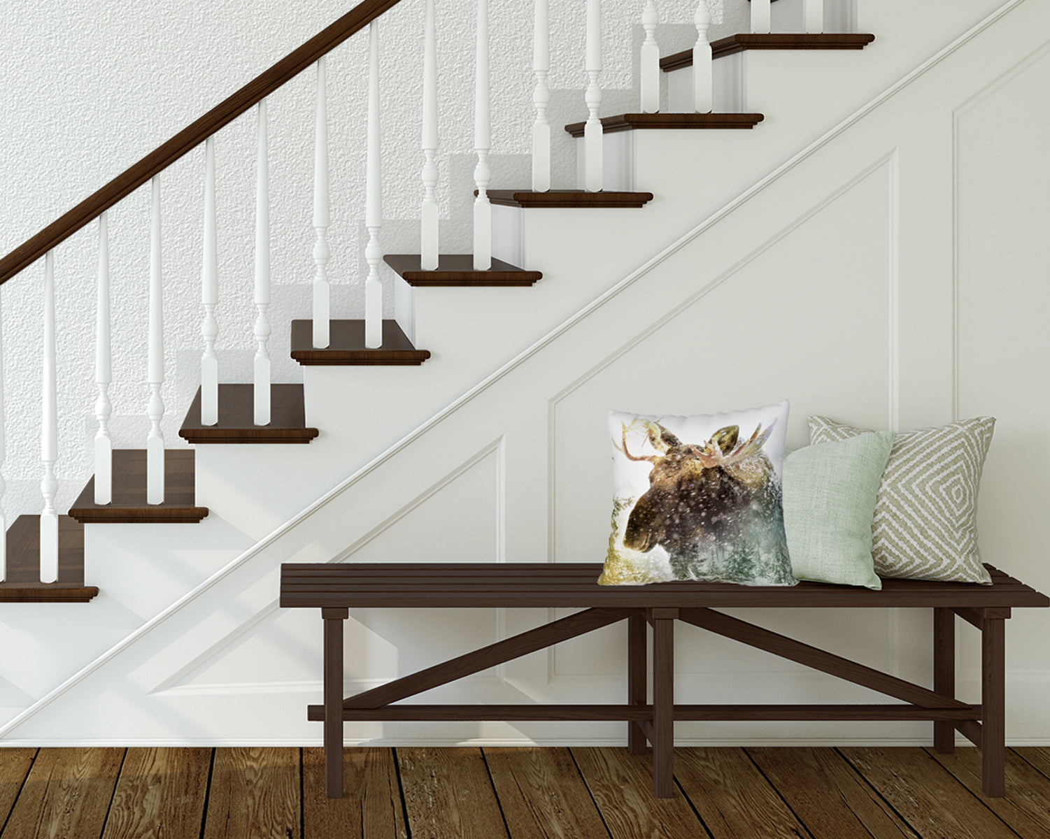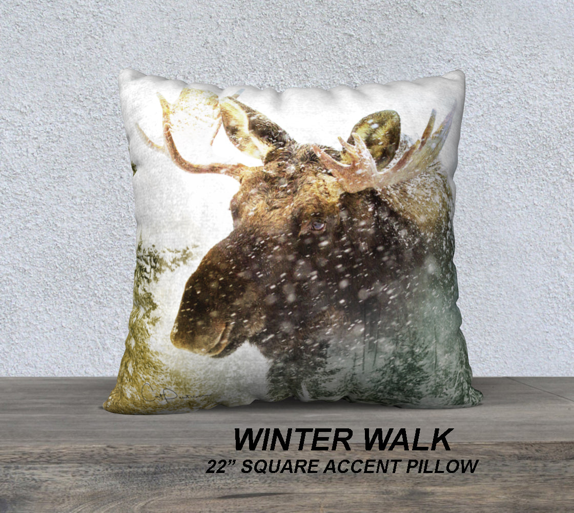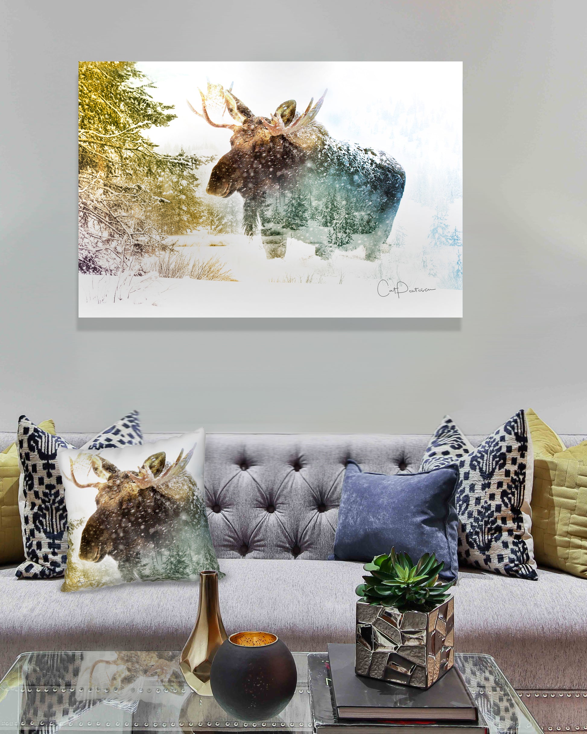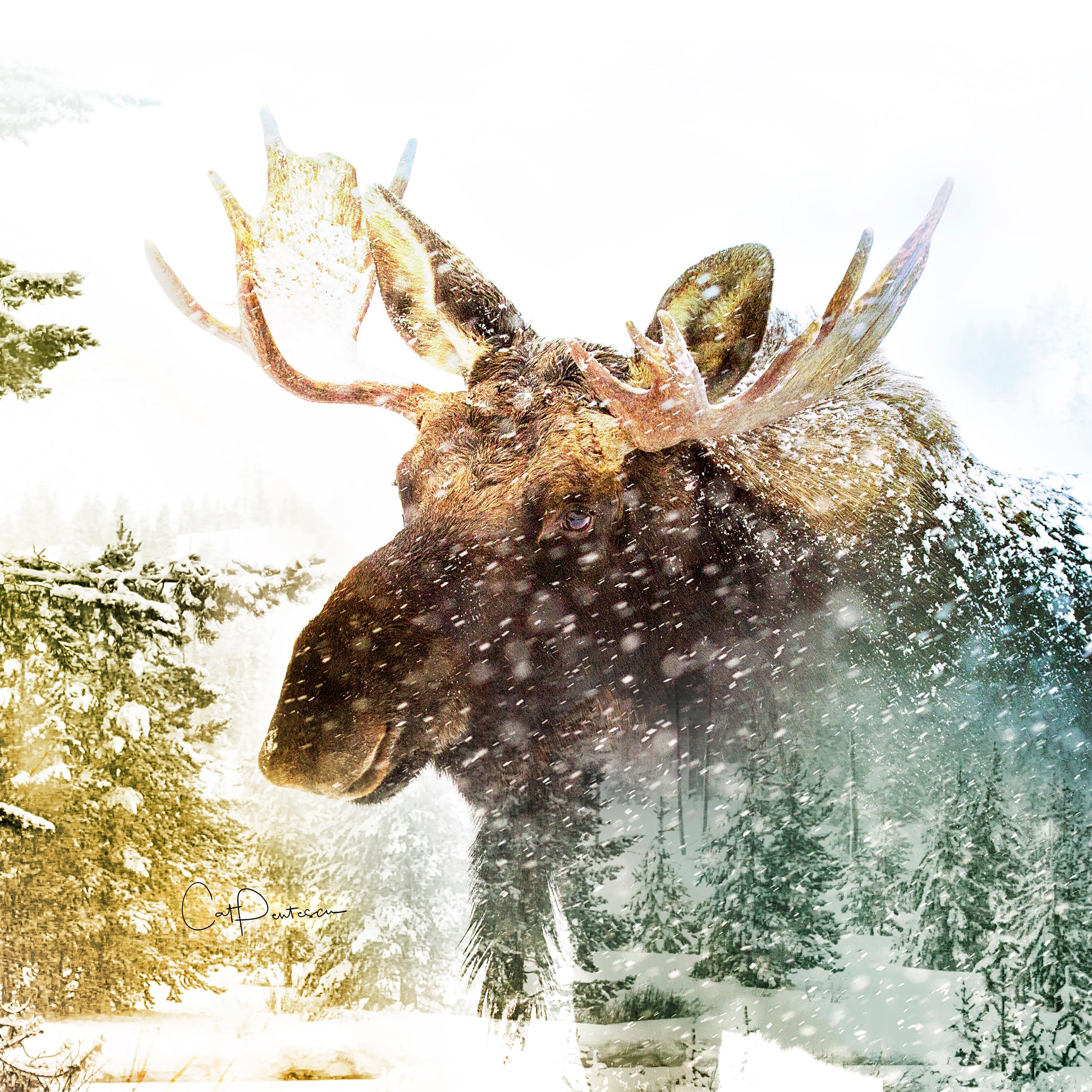 A unique blend of a bull moose in the snow and the scenery that surrounded him.To create this two photo montage, I blended him with a scenery image of the area I found him in, and enhanced the color to create an interesting, original piece.