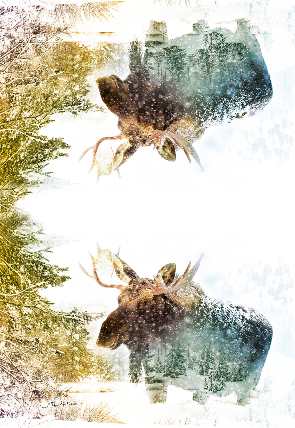 A unique blend of a bull Moose in the snow and the scenery that surrounded him. To create this two photo montage, I blended him with a scenery shot of the area I found him in, and enhanced the color to create an interesting, original piece. He is mirrored and flipped so he is visible whichever way you hang him